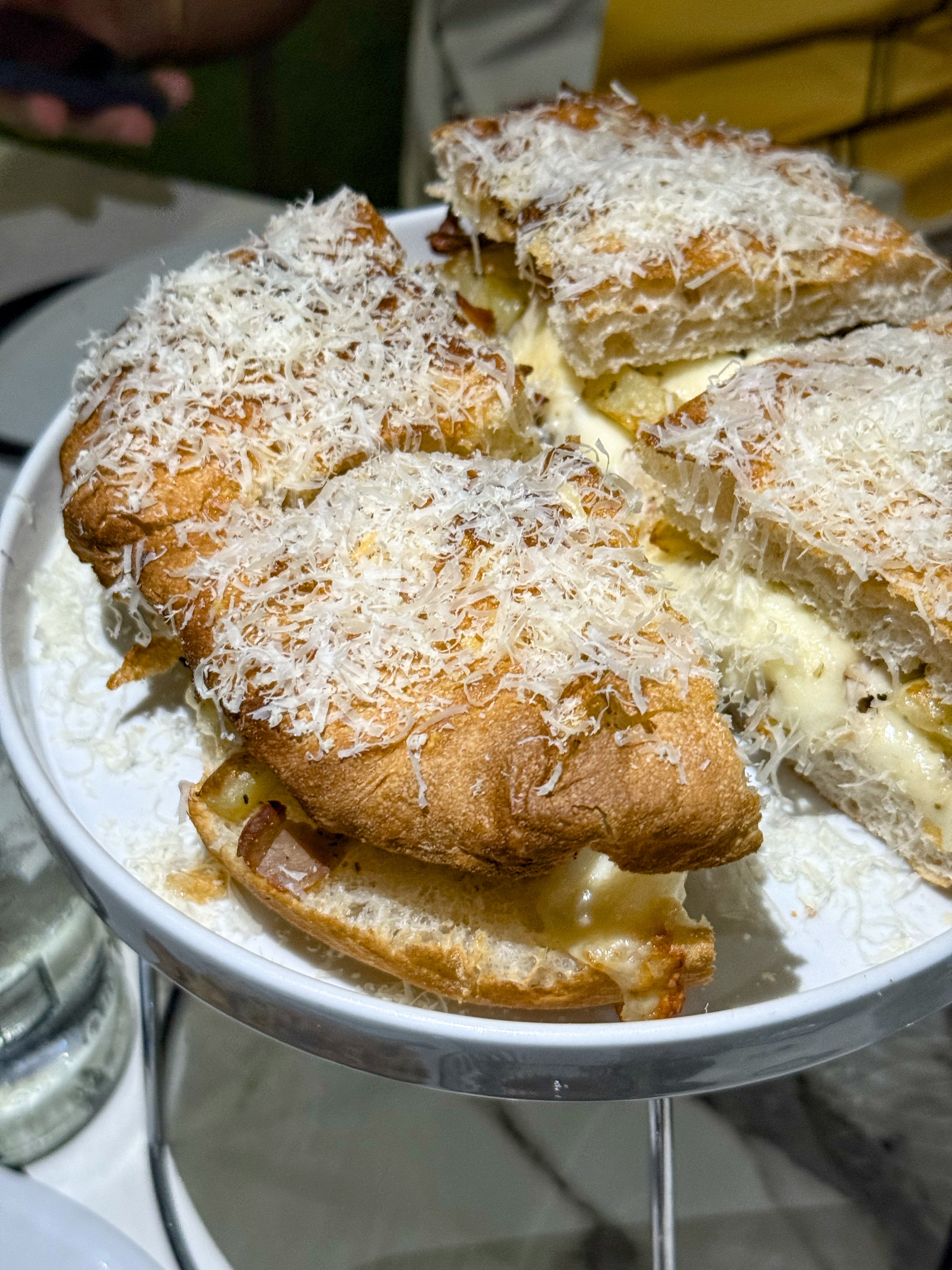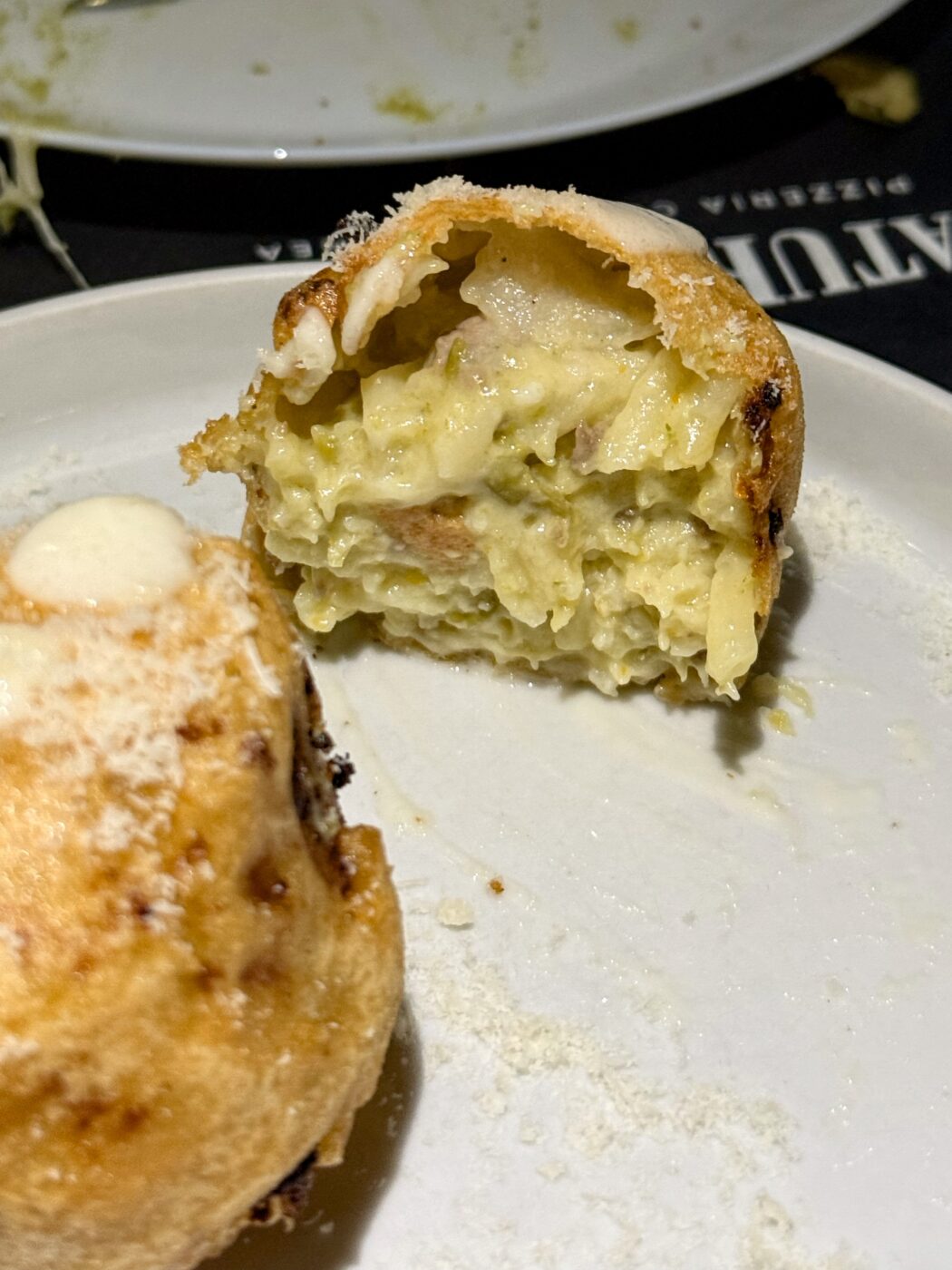 Successivamente è stato il turno di una pizza al padellino (13.50€), ripiena di porchetta, provola, patate al forno con crosta di Stravecchio di Bruna Alpina: ingredienti buoni, impasto invece un po’ troppo asciutto.