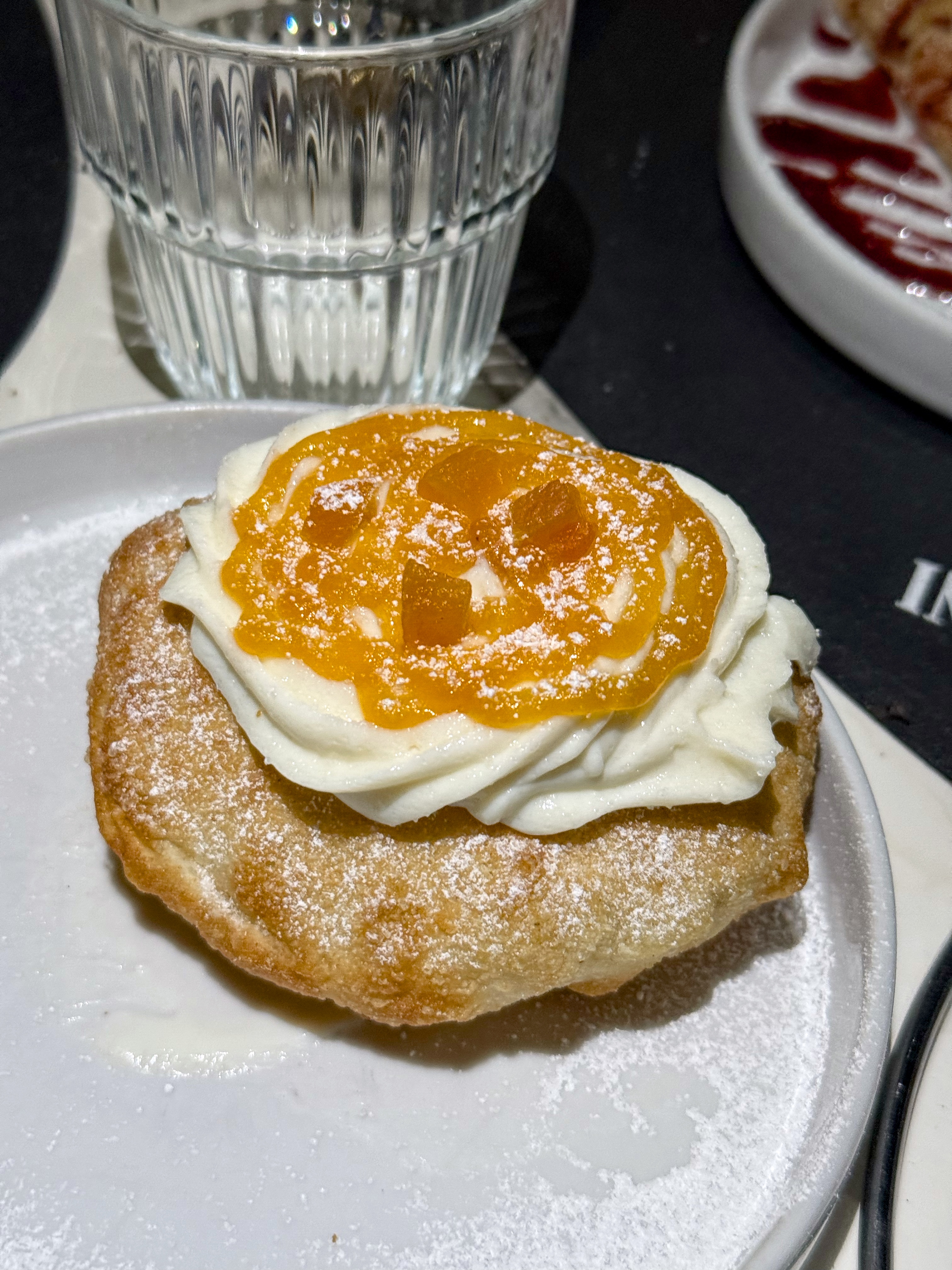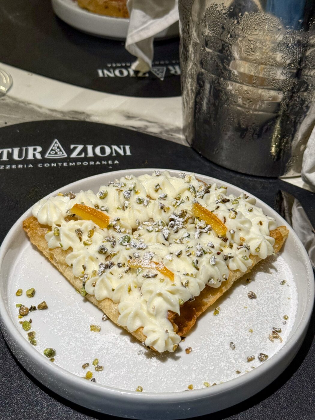 La cena si è conclusa con un assaggio delle pizze dolci, prima fritte e poi al forno. L’aspetto è molto da “food porn” e le quantità di ingredienti presenti su di esse, giocoforza, molto sbilanciata sulla componente zuccherina che di fatto, restituiva un sapore monocorde. Dal trancio con cioccolato bianco, biscotto salato, zucchero a velo; a quello con ricotta dolce , riccioli di cioccolato fondente , arancia candita , granella di pistacchio , zucchero a velo – tutti proposti a 5€ – mancavano di quell’equilibrio e piacevolezza al palato ancora più importanti quando la pizza dolce arriva a conclusione di un pasto completo.