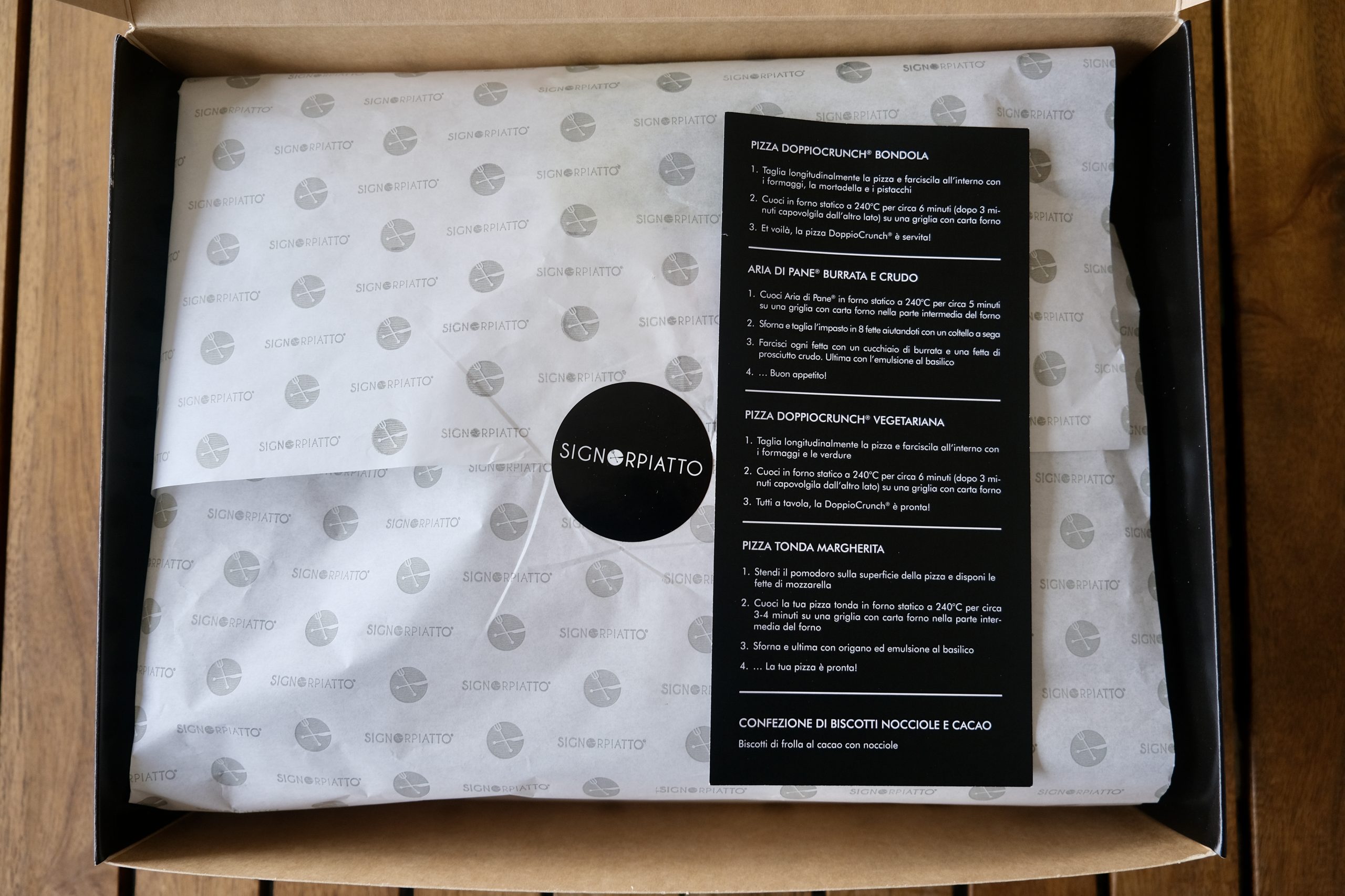 Le basi delle pizze sono precotte e sigillate, il Pizza Box più corposo è contenuto in due scatole differenti confezionate in maniera molto elegante e con alcuni flyer che presentano le istruzioni per la preparazione, i loghi di SignorPiatto e la collaborazione con Renato Bosco.