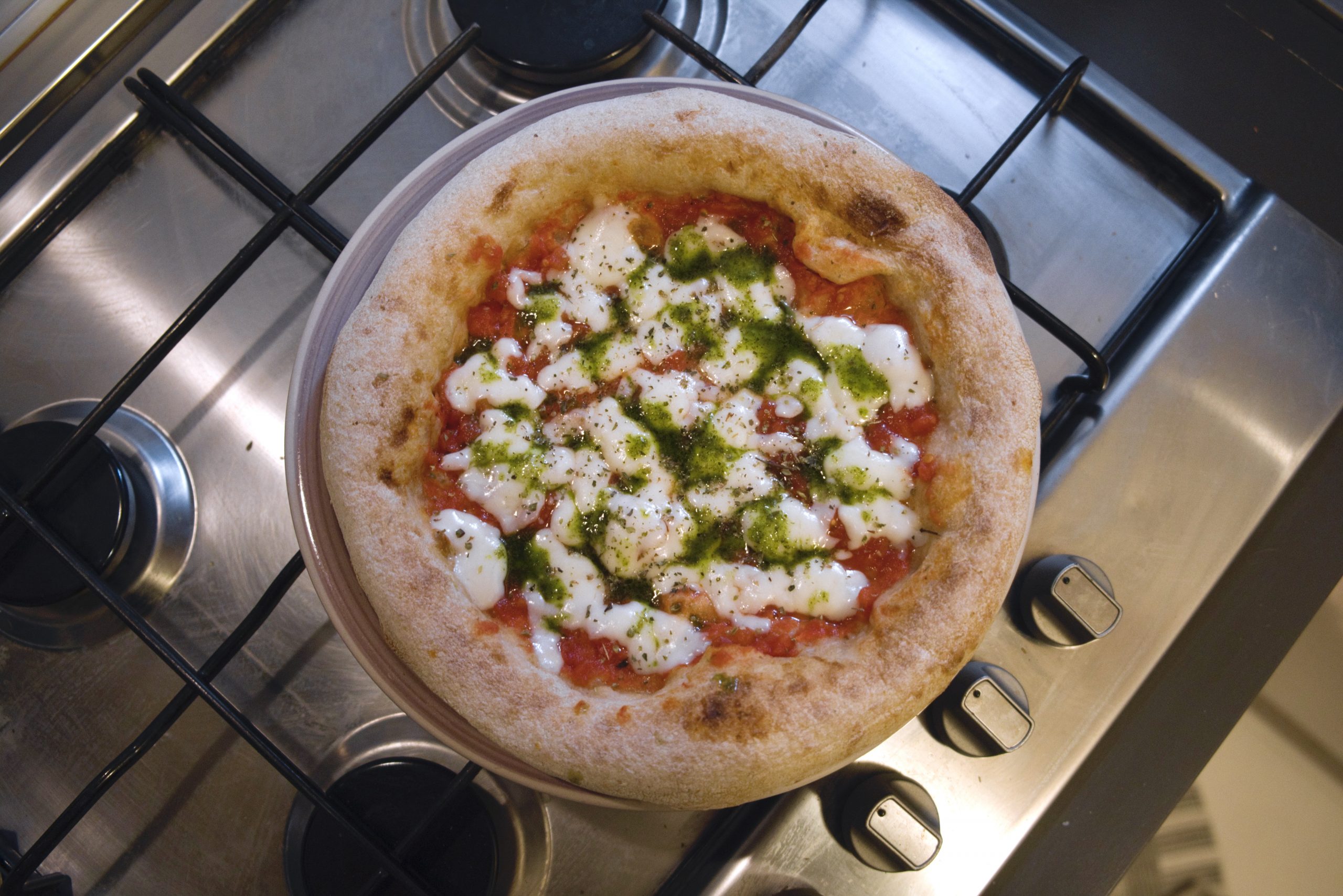 La prima pizza con la quale mi sono cimentato è la Tonda, precotta già con base pomodoro. L’ho condita con quello presente in bustina, ho disposto il fiordilatte (anziché la Bufala suggerita) e rigenerato la pizza nel forno elettrico (preriscaldato a 250 gradi, statico) per circa 4 minuti in posizione centrale su griglia, con carta forno. In uscita, infine, ho disposto l’origano e l’emulsione di basilico.