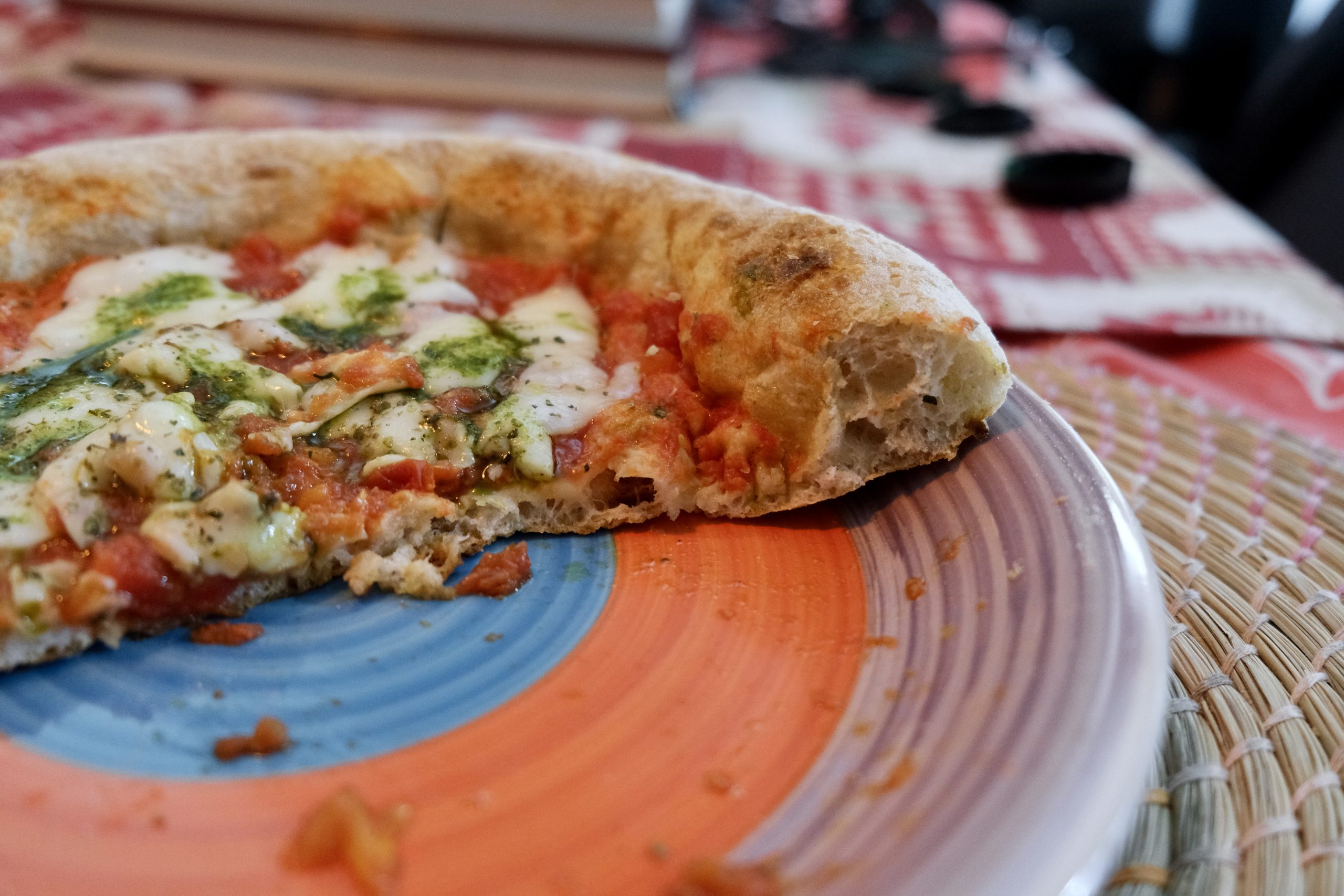 La consistenza dell’impasto rimane convincente e non biscottata, così come la sapidità complessiva fino all’interessante emulsione di basilico, che funziona anche “da olio” per rendere più umida la pizza. Meno impressionante il fiordilatte, che ha subito maggiormente il processo differito di conservazione fino alla consumazione.