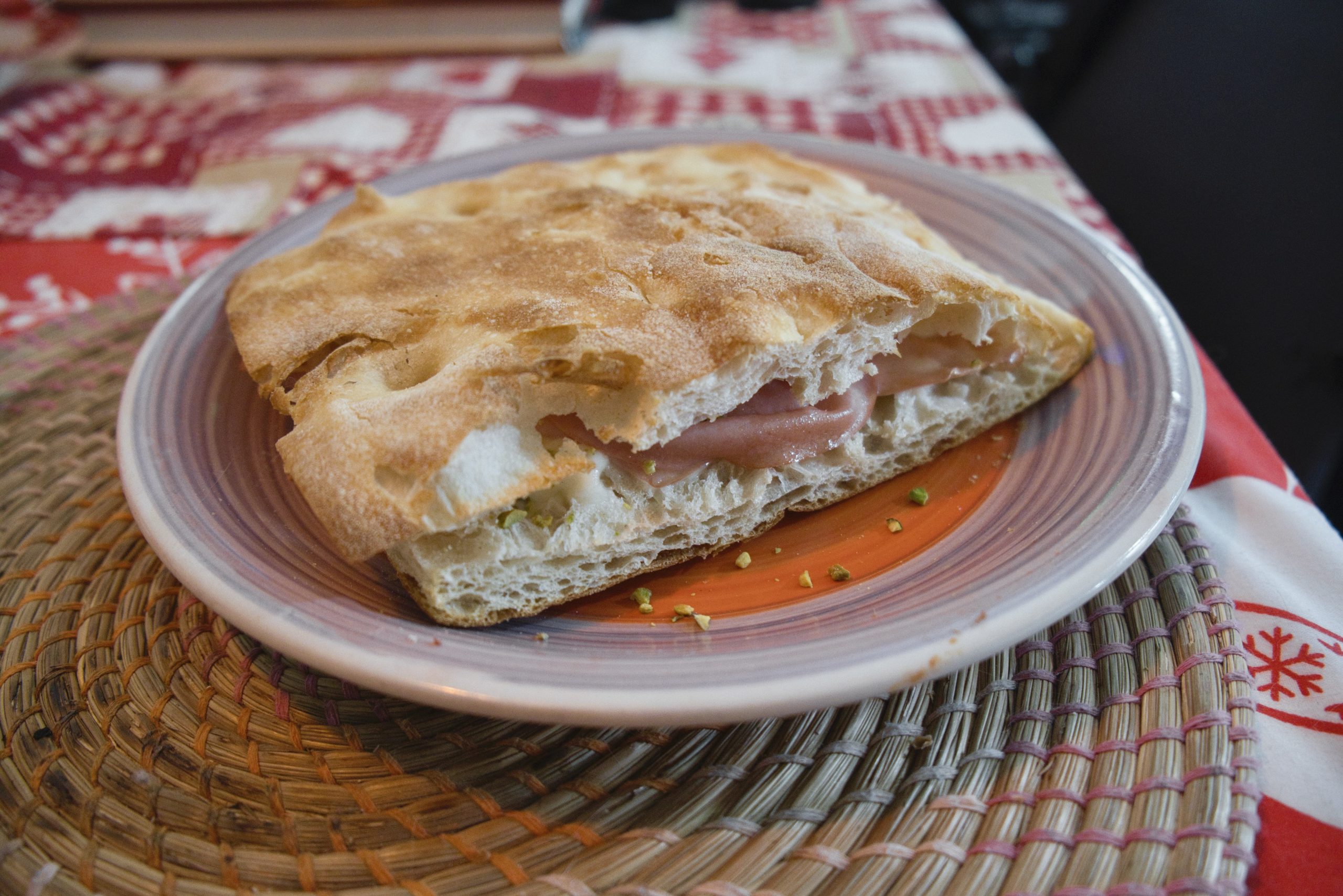 Successivamente è stato il turno della DoppioCrunch, già tagliata longitudinalmente (sulle istruzioni c’è scritto di farlo in autonomia), condita prima della cottura con mortadella, pistacchio, stracchino e bufala. Tre minuti in forno, altri tre capovolta, stesse temperature e posizione della Tonda.