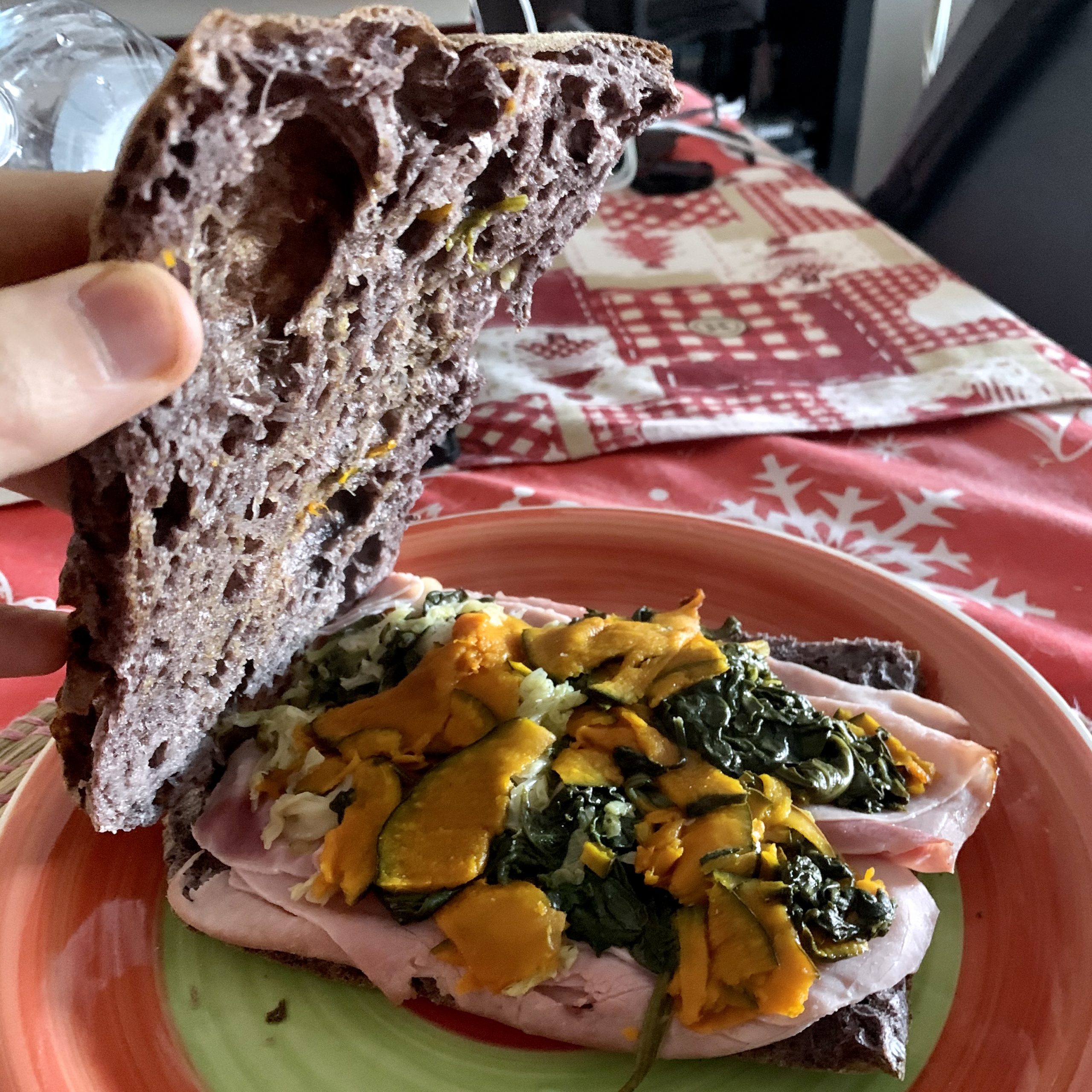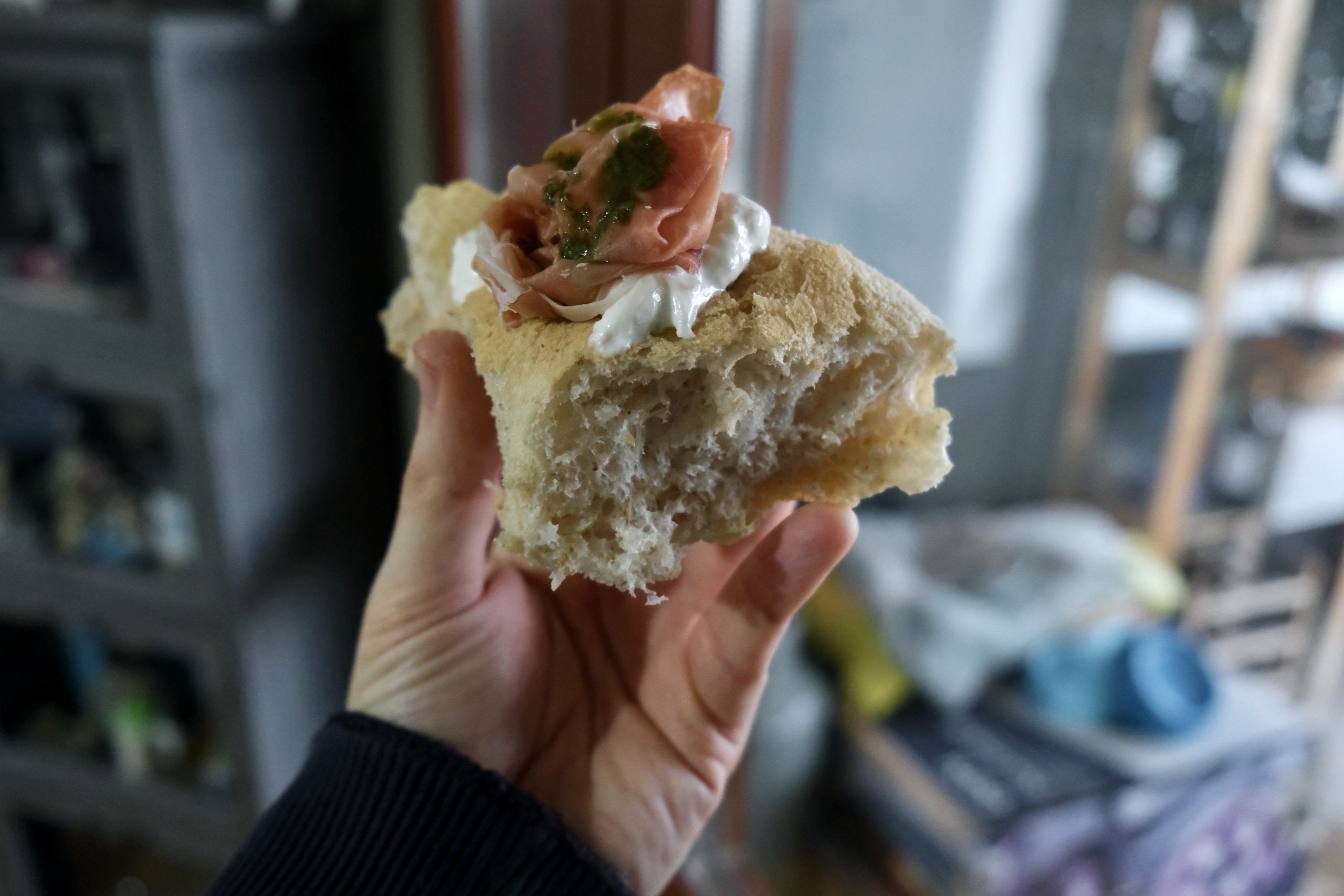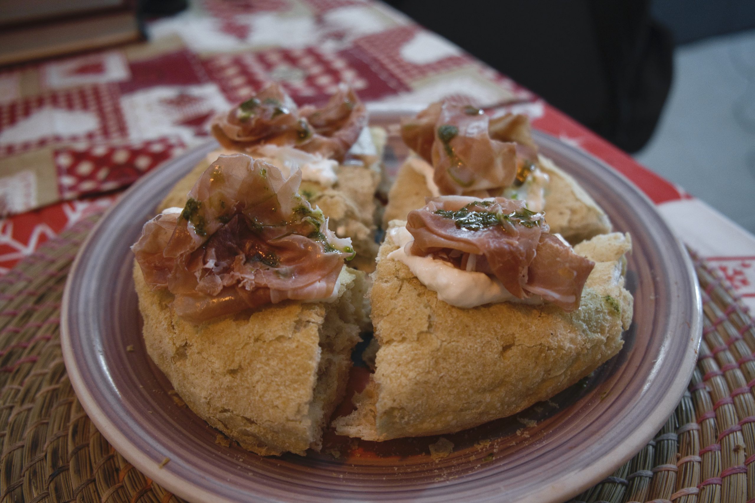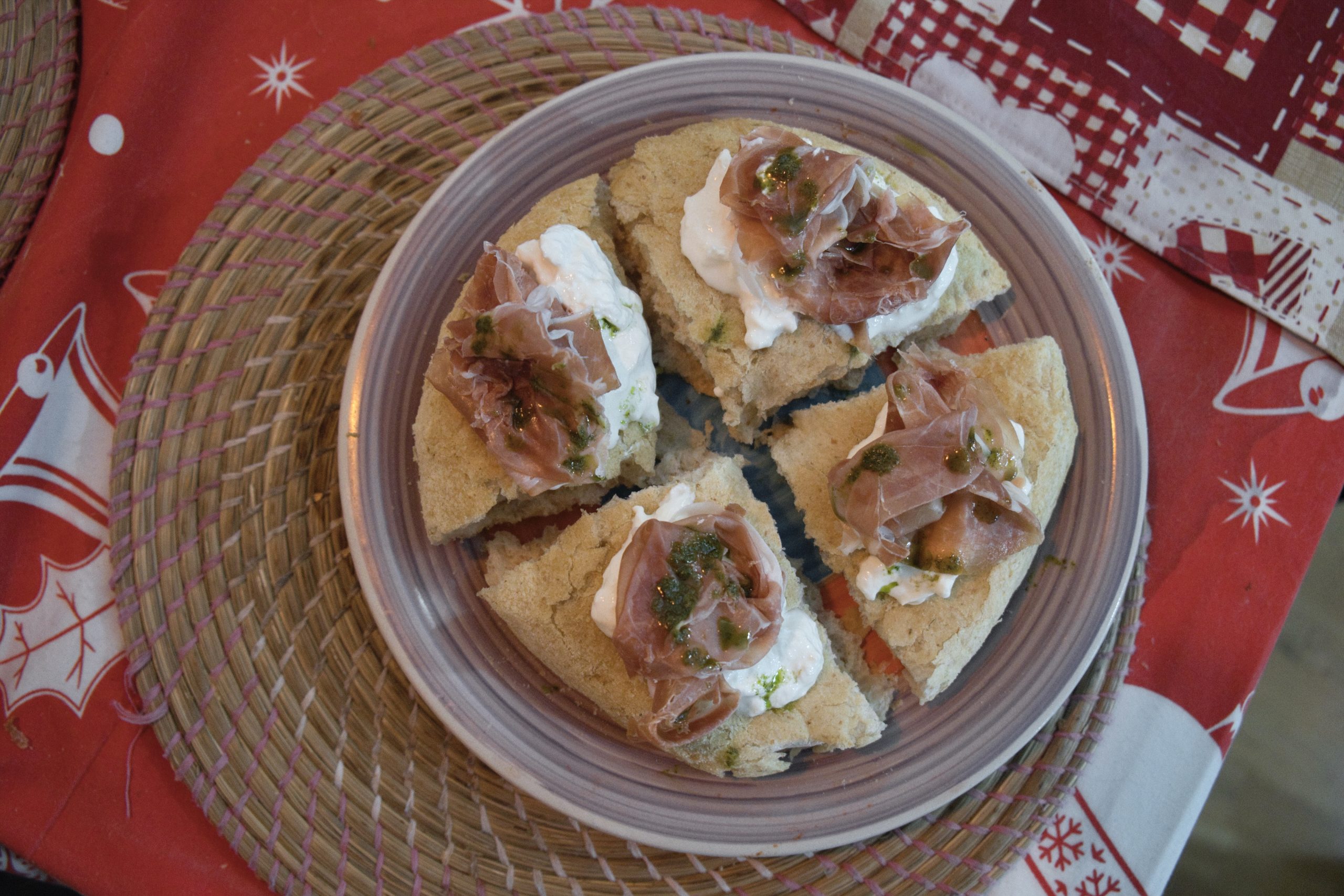 Dulcis in fundo l’Aria di Pane, altra tipologia di impasto identitaria di Renato Bosco, che punta sulla leggerezza e sofficità percepite al morso contestualmente alle dimensioni voluminose. Le ho indubbiamente percepite dopo la cottura di 5 minuti e la suddivisone in spicchi (io ne ho fatti quattro, ne vengono suggeriti otto). L’abbinamento perfezionato in uscita, quello con burrata e prosciutto crudo, è un classico di gran succulenza, supportato dalla qualità degli ingredienti. L’impasto, che rimane buono, è però quello che ho avvertito più “lontano” rispetto all’originale provato in pizzeria di Renato Bosco: il forno elettrico di casa è ulteriori discriminante in questo caso.