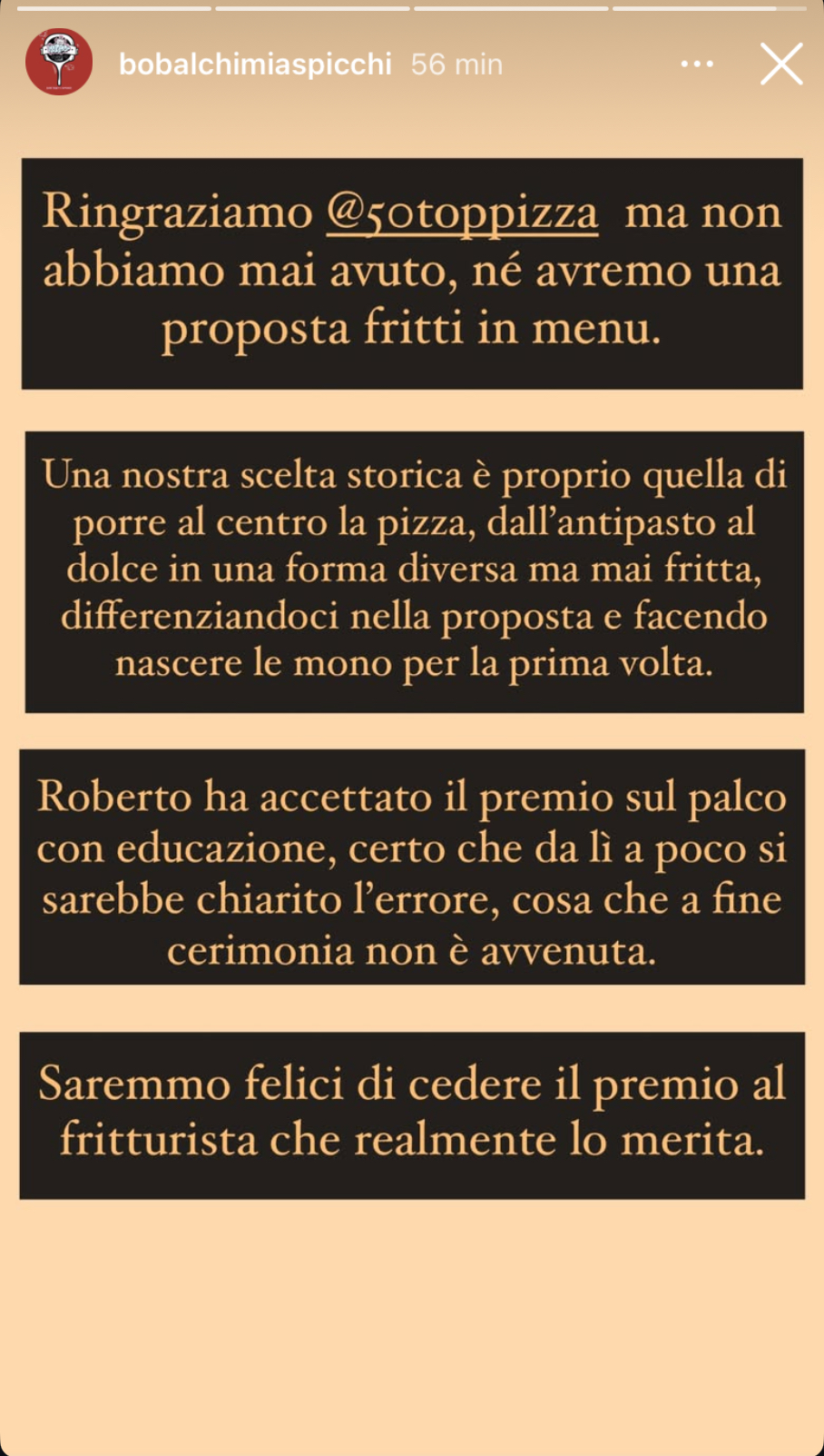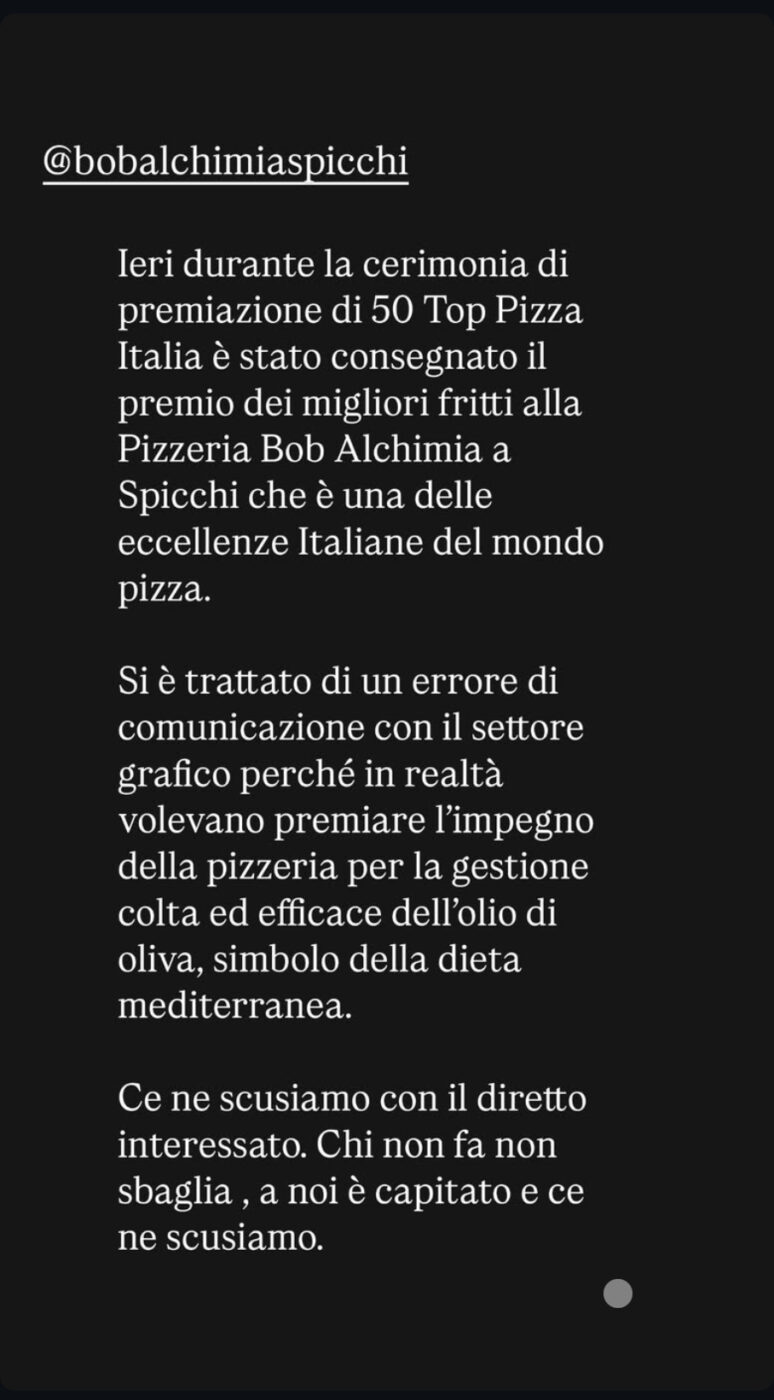 La toppa è stata peggio del buco ed è stata affidata ad una comunicazione scritta sui social con un italiano piuttosto incerto: guardate, è stato un errore dei grafici e volevamo premiare “l’impegno della pizzeria per la gestione colta ed efficace dell’olio d’oliva”. Peccato che ovunque sul sito, sul palco, negli articoli pubblicati dai curatori e nei comunicati stampa ripresi dalle altre testate, il premio assegnato fosse proprio quello per la miglior proposta di fritti.