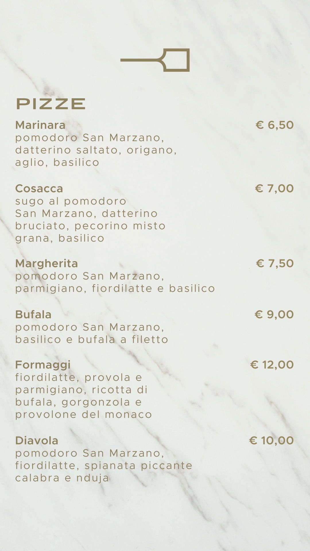 Biga sarà (è) un locale dal taglio moderno con circa 60 posti a sedere all’interno e 20 all’esterno; il forno è a vista nella parte finale della sala, l’offerta prevede allo stato attuale 25 pizze, un tris di montanare, fritti tradizionali, dolci fatti in casa e alcune insalate. Il nome si rifà pesantemente alla lavorazione dell’impasto, è di facile lettura soprattutto per i milanesi (no pun intended.) ed è situata come detto in una delle zone neo-vip di Milano, con il motto “la moda passa, la pizza resta”. Se buttiamo un occhio al menu invece, i prezzi partono dai 6,50€ per la Marinara ai 7,50€ per una Margherita, fino ai 14€ per la pizza denominata “Tarallo” (la trovate più avanti); fritti e dolci spaziano in un intervallo di 3€-6€. Qui sotto trovate un estratto del menu.