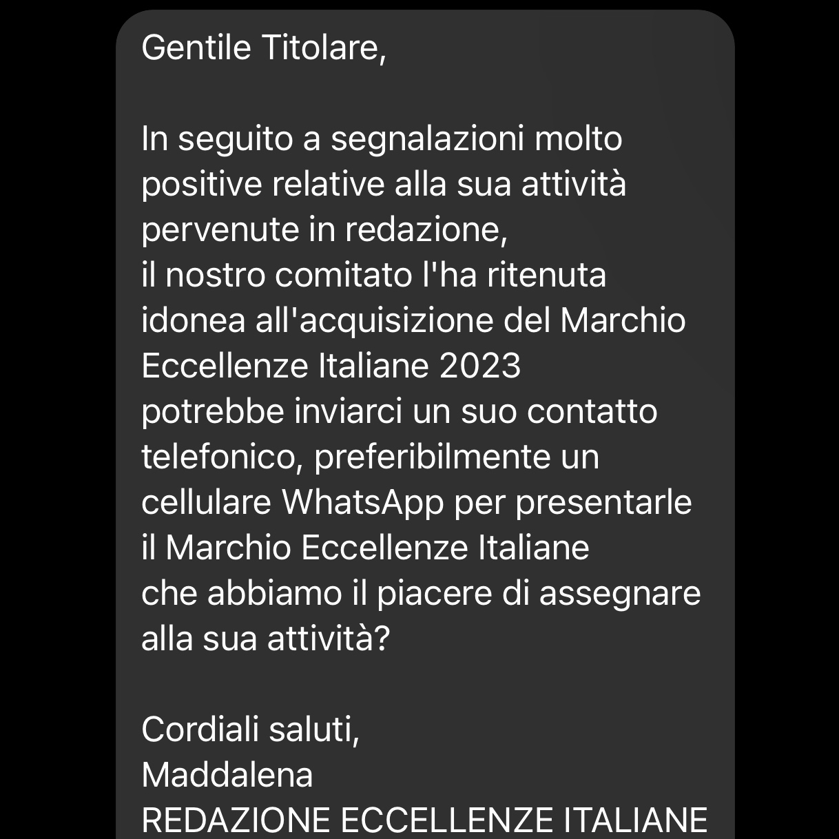 Ebbene, vibrazioni simili me le ha date “Eccellenze italiane”, che oramai a cadenza annuale mi contatta su Instagram e Facebook per conferirmi una grande onorificenza come se fossi titolare di un’attività commerciale, anzi l’attività commerciale stessa.