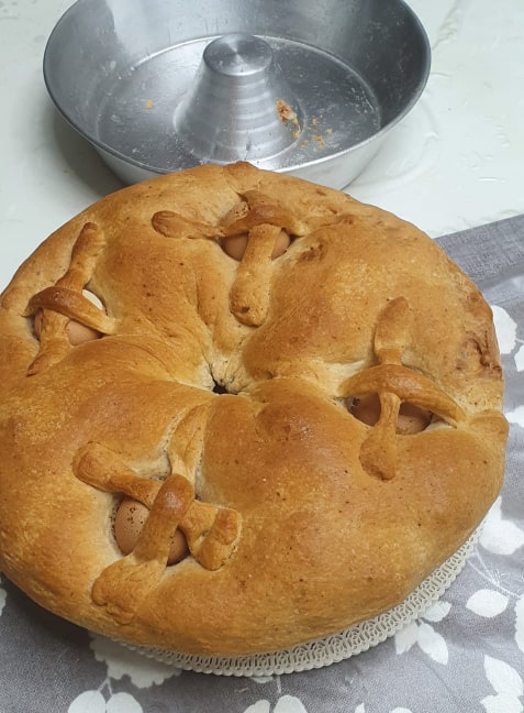Il casatiello napoletano è probabilmente ancora più antico della pizza: è una sorta di “pane ripieno” di salumi e formaggi, sormontato da uova sode messe nei “cestini”, cioè delle conchette scavate nell’impasto. È una preparazione tipicamente pasquale, con molta simbologia alle spalle: l’abbondanza prima di tutto, la condivisione di un bene così ricco (il casatiello è familiare e qualche volta anche multifamiliare!) e la rinascita in vista della primavera. Il casatiello differisce dal tortano (altra torta rustica ripiena) per la posizione delle uova: il tortano infatti le prevede tagliuzzate e messe all’interno con la farcitura, non come decorazione sulla parte superiore.