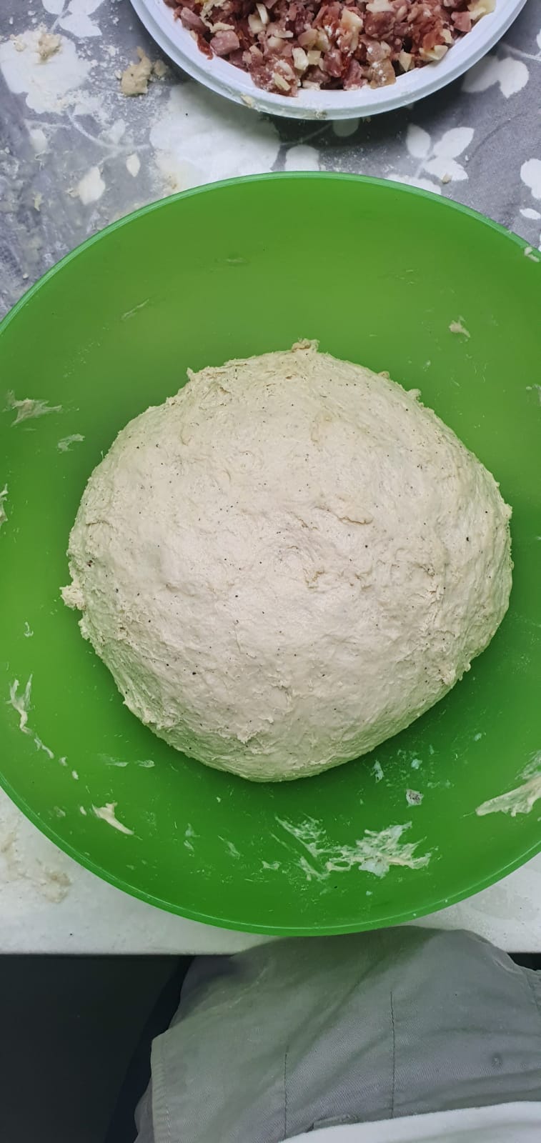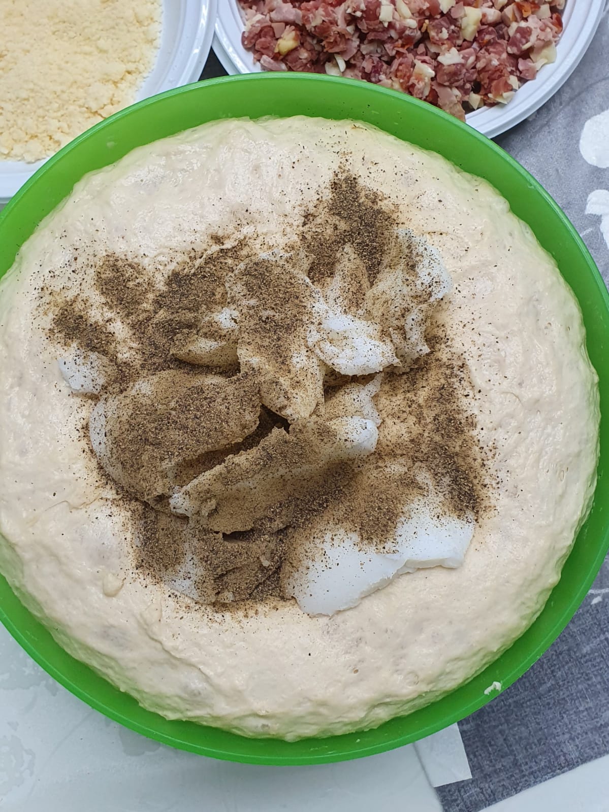 Se il composto non è perfettamente liscio, non preoccupatevi: questo non ne comprometterà la buona riuscita del casatiello. Fatte queste operazioni, lasciamolo lievitare per 2 ore coprendolo con un panno. Trascorse questo lasso di tempo, aggiungiamo 250 grammi di sugna e 3 grammi di pepe: impastiamo per altri 15 min e lasciamo lievitare il nostro casatiello per ulteriori 90 minuti.
