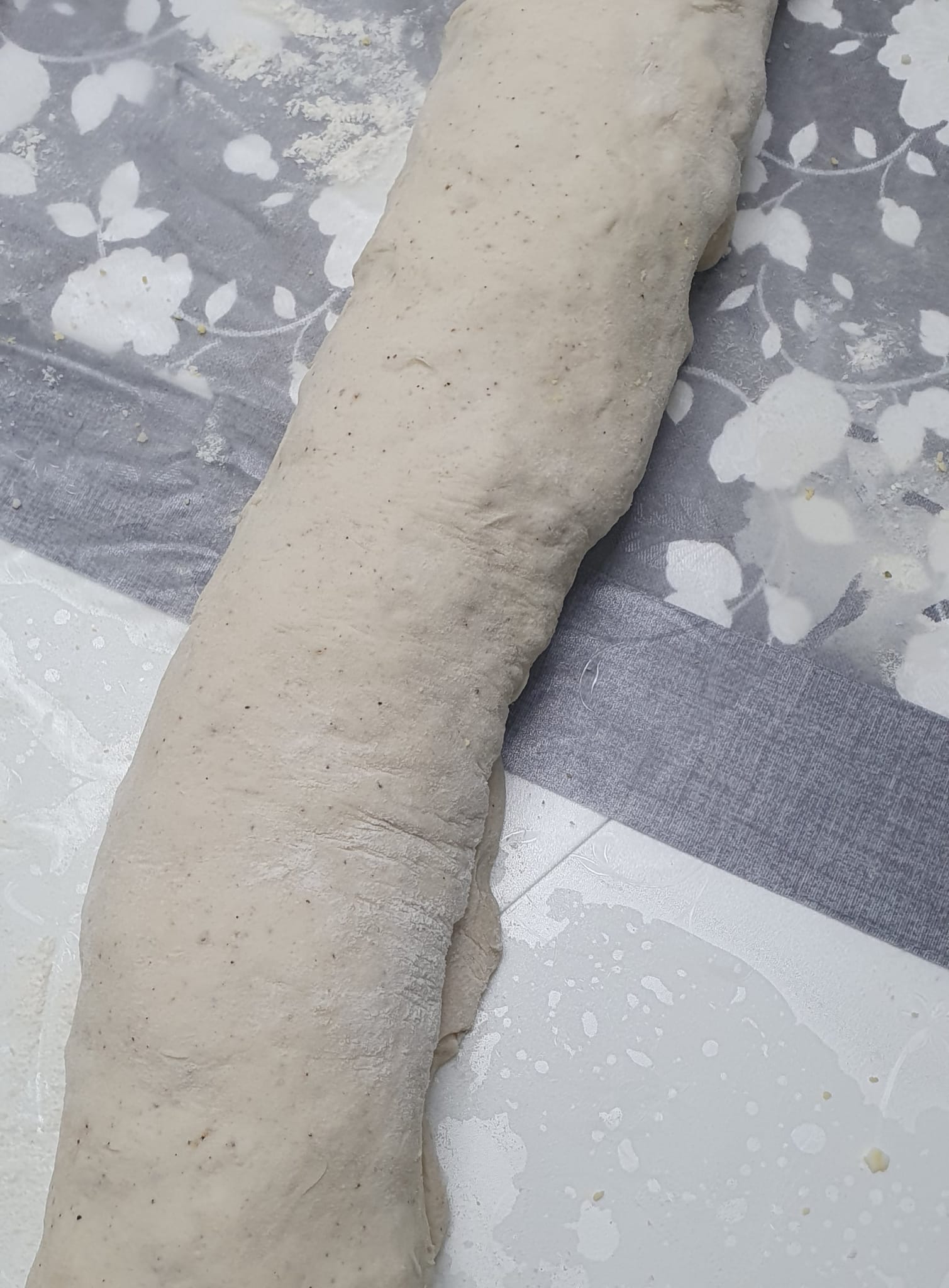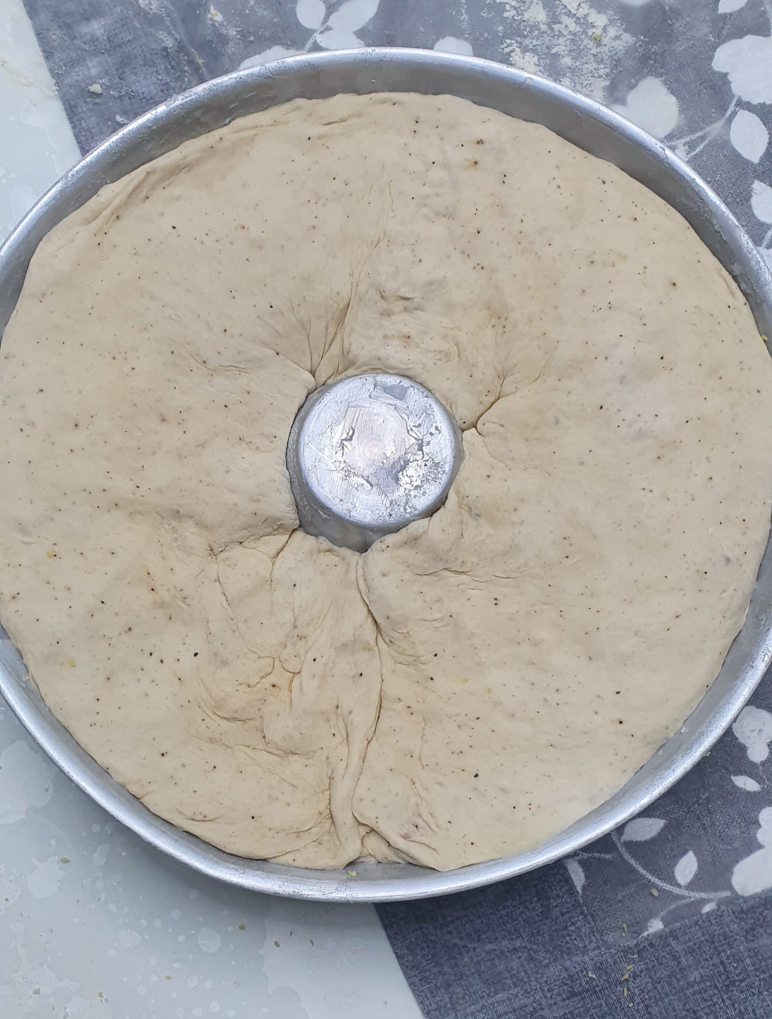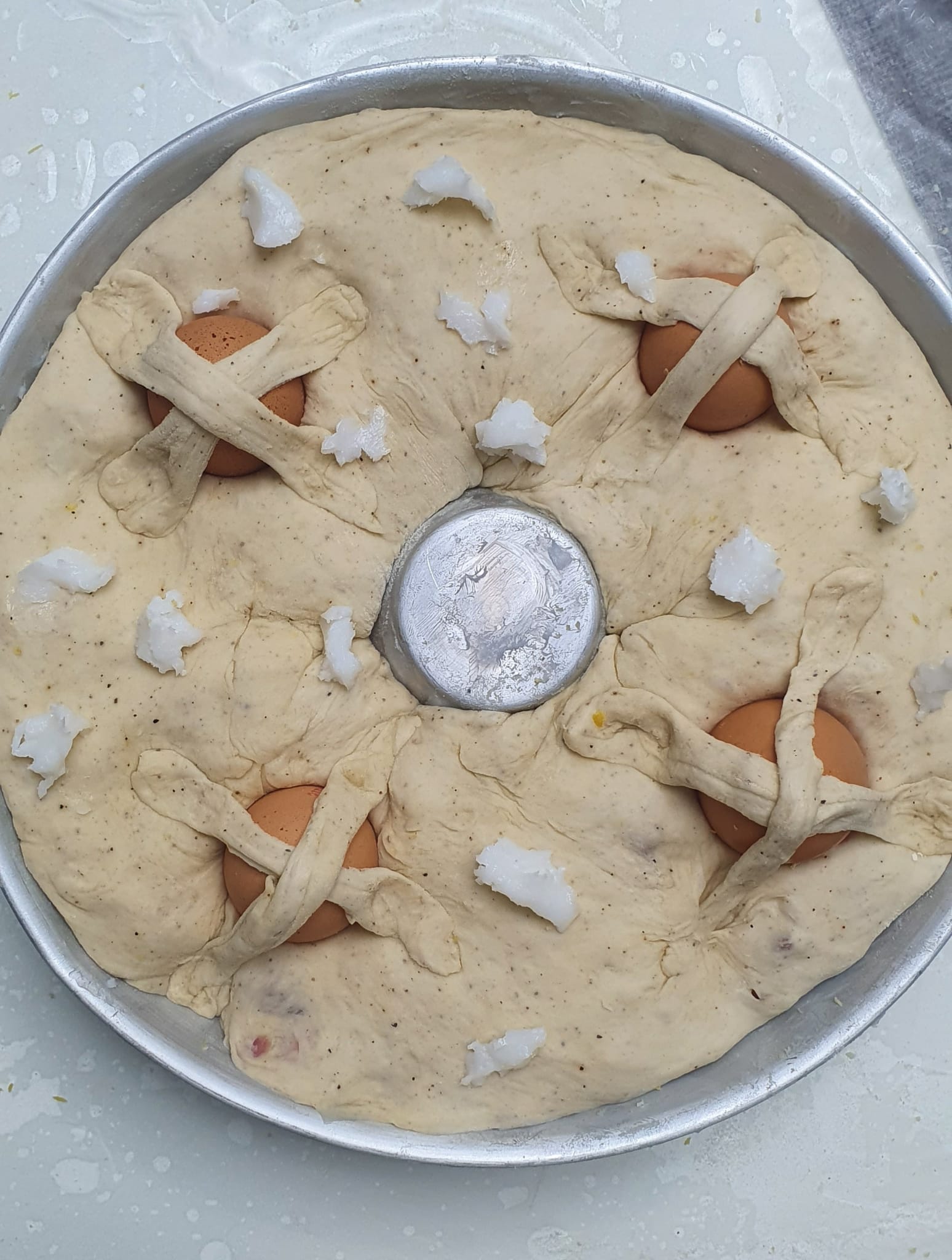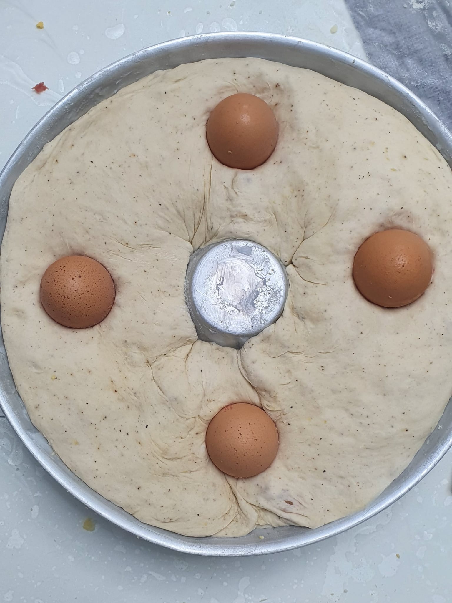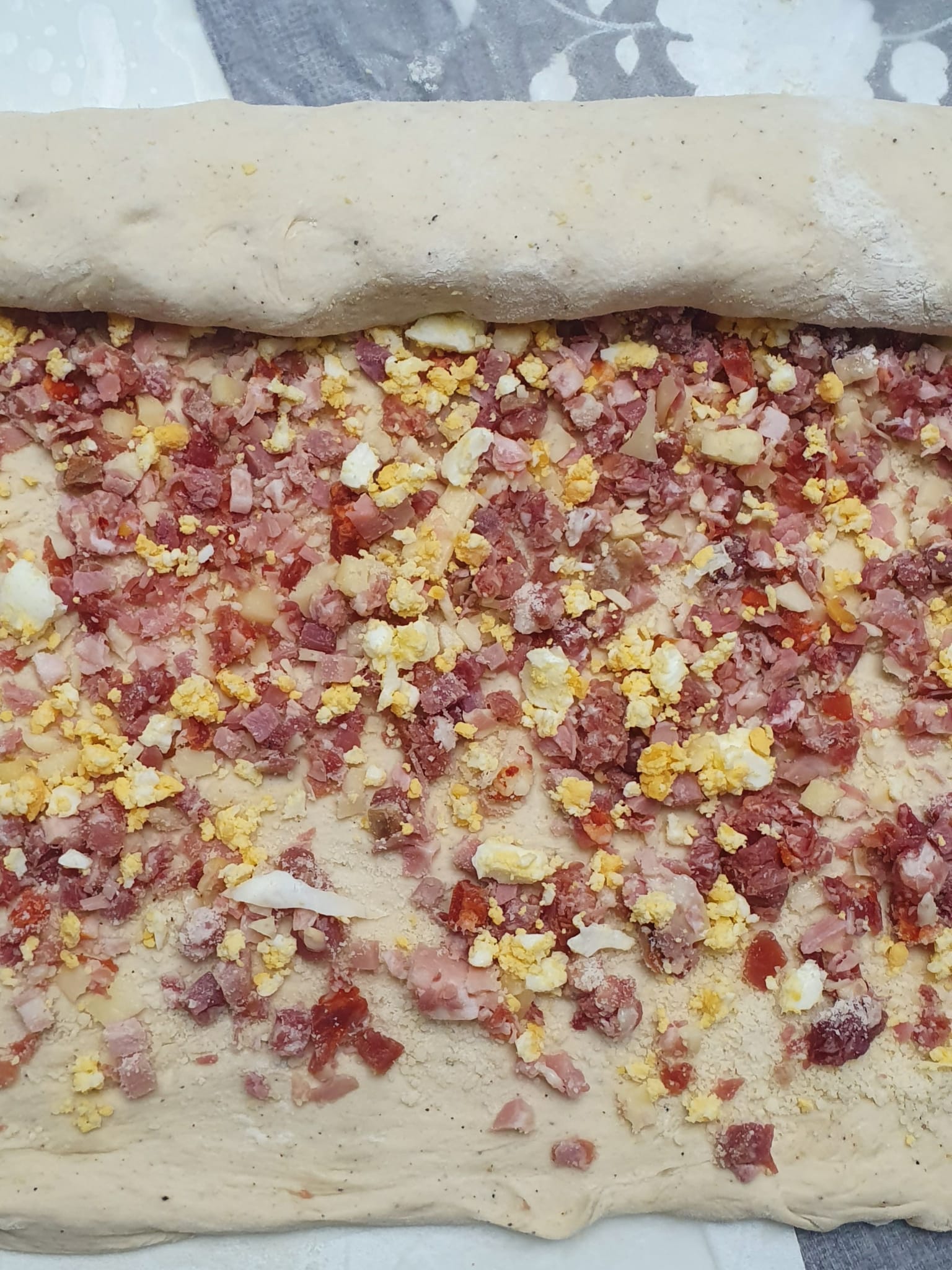 Trascorsi i 90 min stendiamo il nostro impasto (avendo cura di tenere da parte un po’ di impasto stesso per fissare le uova decorative) e lo andiamo a farcire con 50 grammi di formaggio pecorino, 500 grammi di salumi, 200 grammi di provolone piccante e 4 uova sode; dopo aver steso con cura salumi e formaggi in maniera uniforme lo arrotoliamo e lo mettiamo all’interno dello stampino unto precedentemente con la sugna. Uniamo bene le due estremità e aggiungiamo 4 uova intere fissandole con dei pezzetti di impasto che ci siamo conservati prima, aggiungiamo qualche ciuffo di sugna, per mantenere morbida la superficie del rustico.