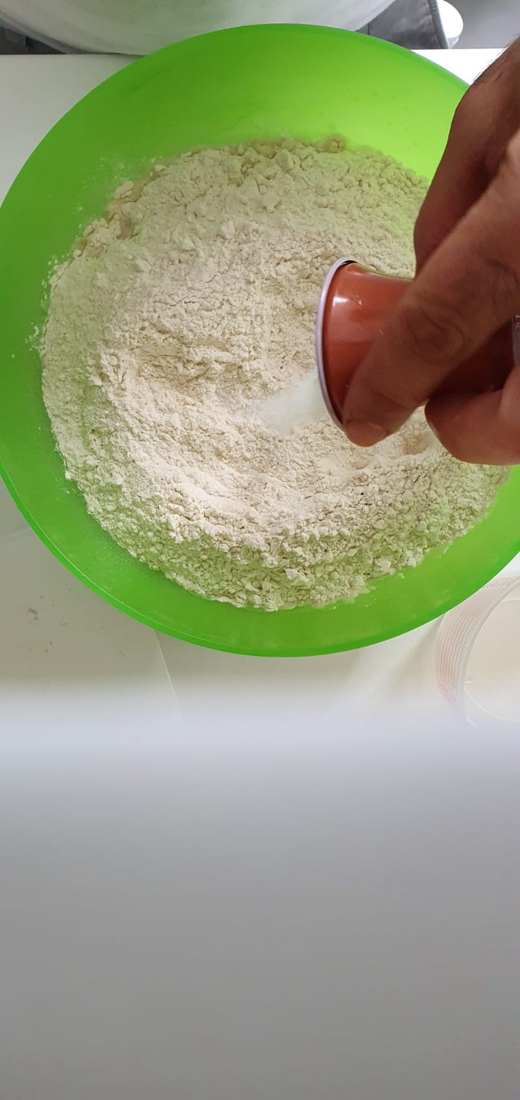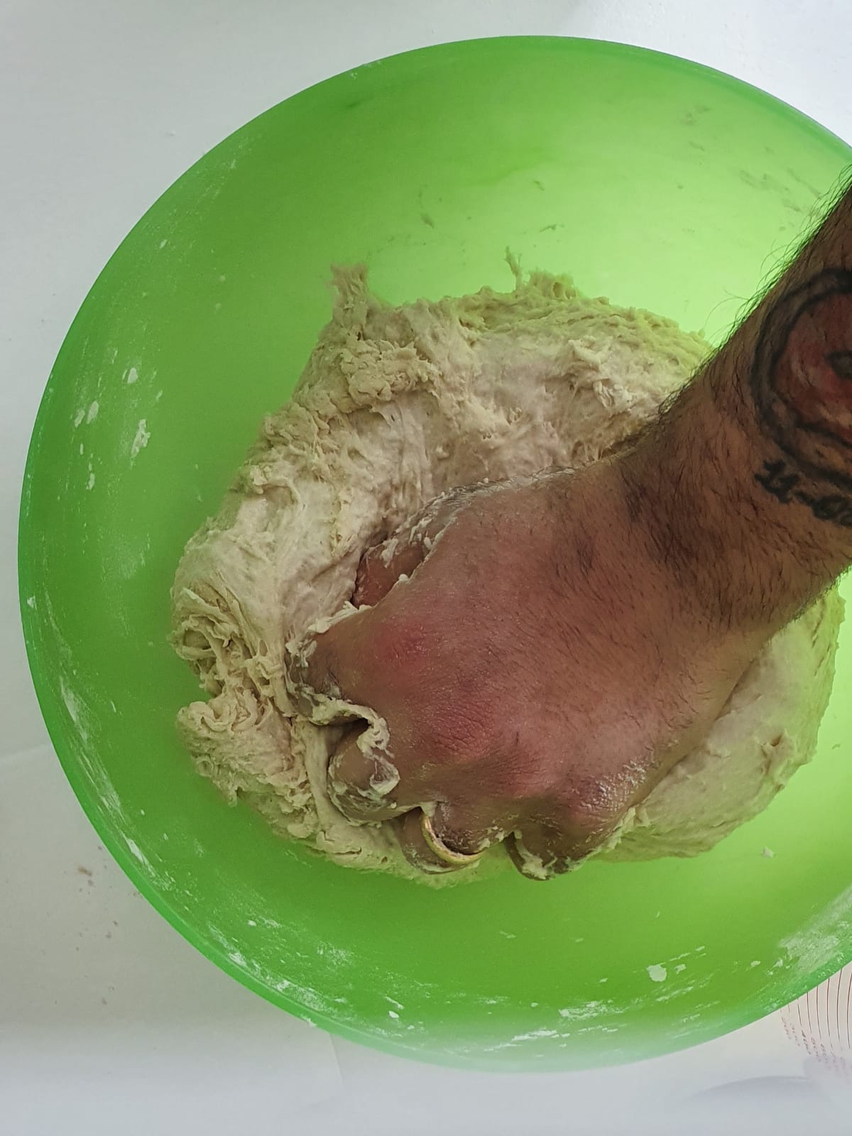 All’interno di un recipiente largo e spesso (tipo una boule di metallo ma va bene anche una classica bacinella opportunamente sterilizzata), versiamo in ordine: acqua, zucchero e lievito e iniziamo a mescolare fin quando il lievito si é ben sciolto. A questo punto versiamo la farina e il sale e continuiamo a lavorarlo per 15 minuti circa, fin quando non otteniamo un composto omogeneo.