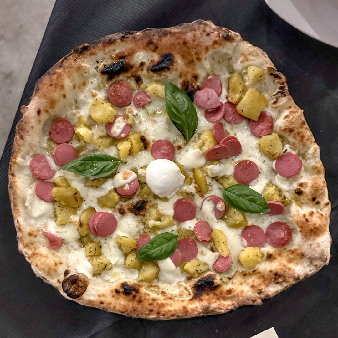 La Pizzeria del Corso si trova a Pietramelara, in provincia di Caserta, vicino le fonti di Riardo. Al comando c’è Cosimo Chiodi che si diletta con diverse tipologie di impasti e di pizze, compresa quella nel ruoto. Tra Pizze classiche e tradizionali, fritti per aspettare la pizza e creazioni più golose e speciali, c’è la Pizza Campionato…Re-wind fatta con ombra di pomodoro, fiordilatte, salsiccia, melanzane a funghetto e poi in uscita basilico, parmigiano reggiano, cialde di pecorino, pomodorini confit gialli e rossi.