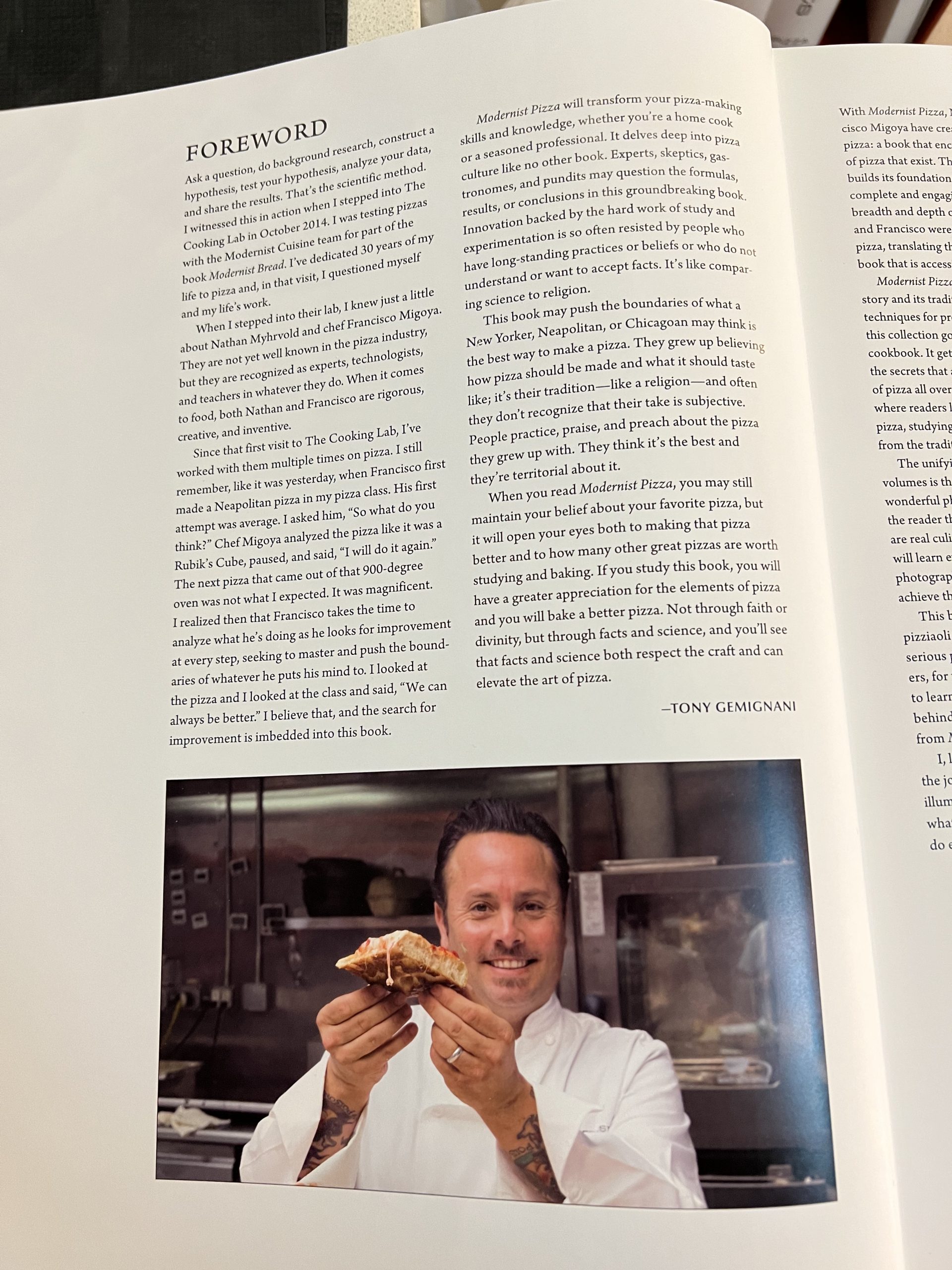 Beh, noi rispettiamo la tradizione, abbiamo un’ampia sezione del libro che elenca tutte le regole. Ma incoraggiamo anche le persone a infrangere quelle stesse regole. E penso che la cucina italiana abbia sempre questa sorta di tensione verso la tradizione, da un lato. Dall’altro lato, quello che rende l’Italia grandiosa non è la terra, le montagne o i borghi… È la popolazione italiana con la sua creatività. La Cappella Sistina non è grandiosa solo perché Michelangelo utilizzava dell’ottima pittura, ma perché era creativo, aveva realizzato qualcosa di innovativo. Parte dell’idea di Modernist Pizza è quella di dire “è possibile fare cose innovative”. Se vuoi realizzare la pizza Detroit Style a Napoli ti diciamo come fare. Oppure ti diciamo come fare una pizza in stile napoletano, oppure ti aiutiamo a trovare un tuo stile personale di pizza.