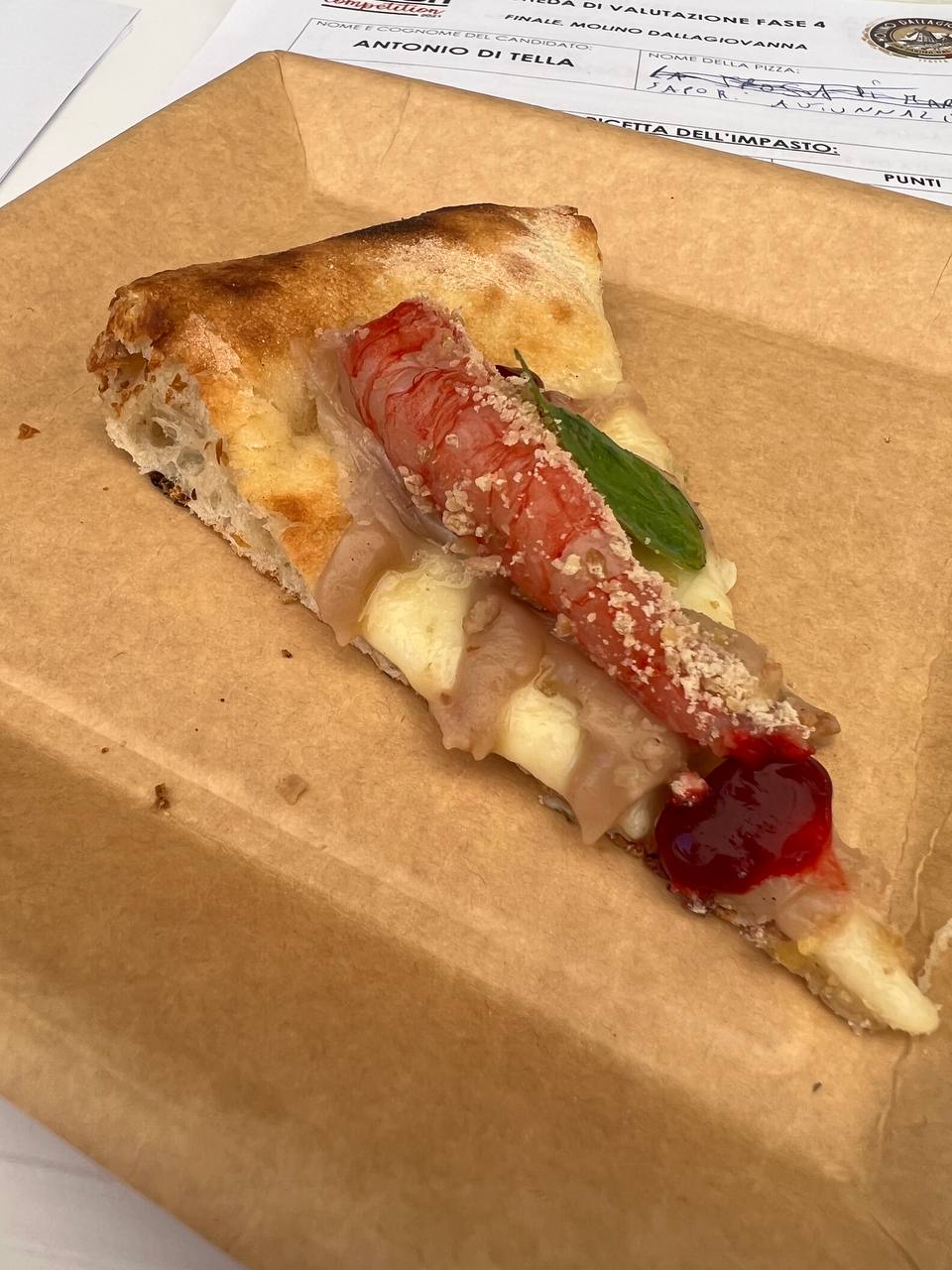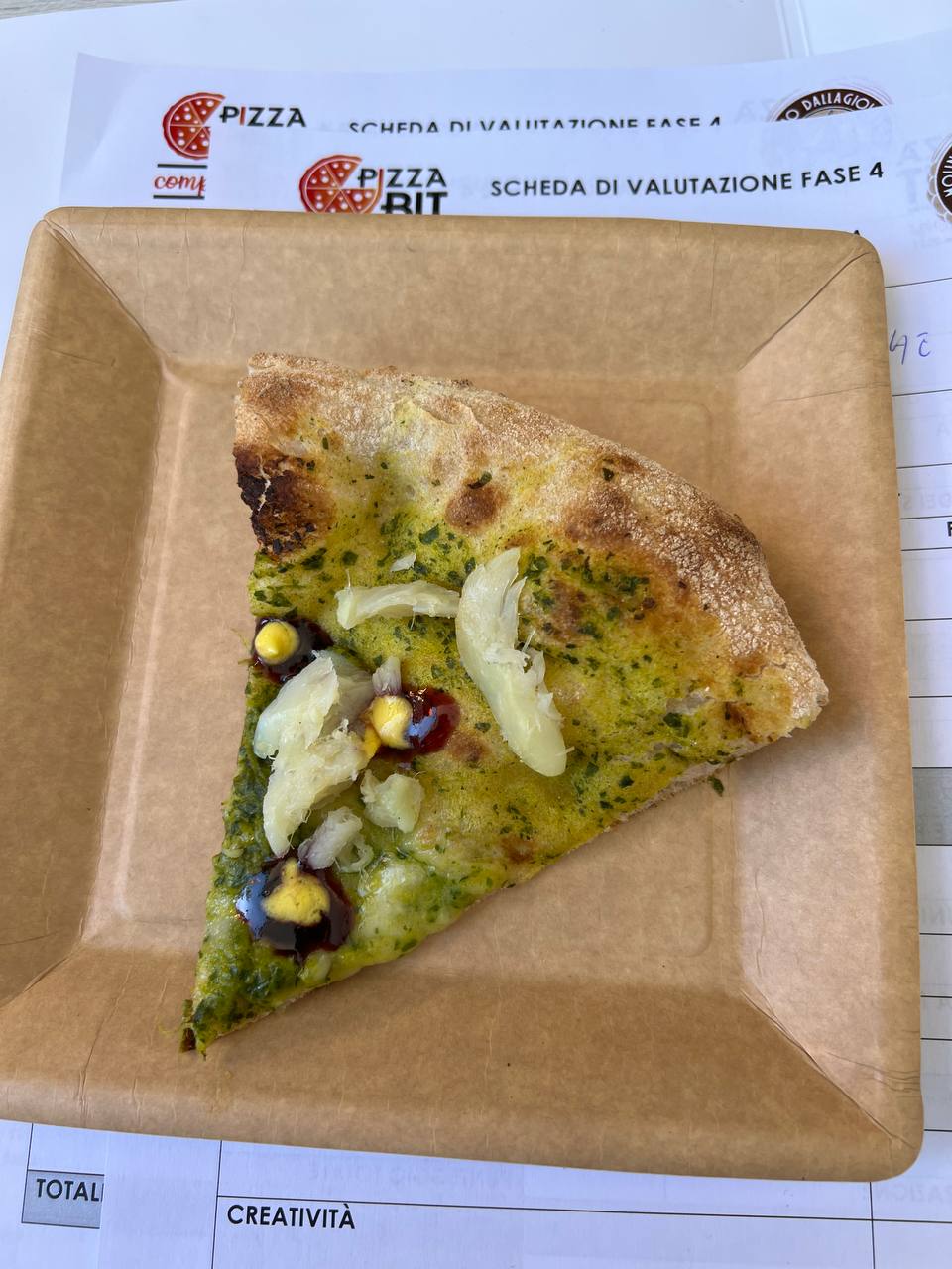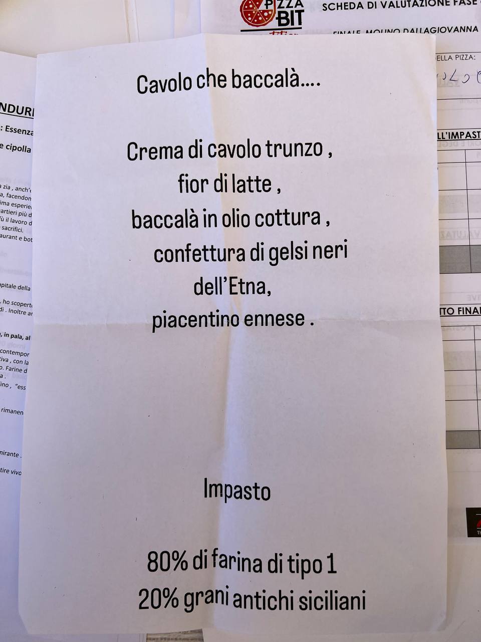 Il penultimo finalista della giornata si è presentato con una Pizza chiama Cavolo che baccalà e, come suggerisce il nome :D, è fatta con crema di cavolo trunzo, fior di latte, baccalà in olio cottura, confettura di gelsi neri dell’Etna e formaggio piacentino ennese.