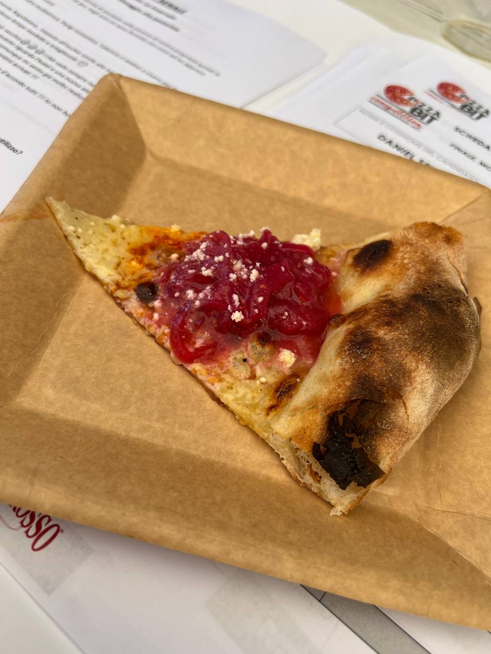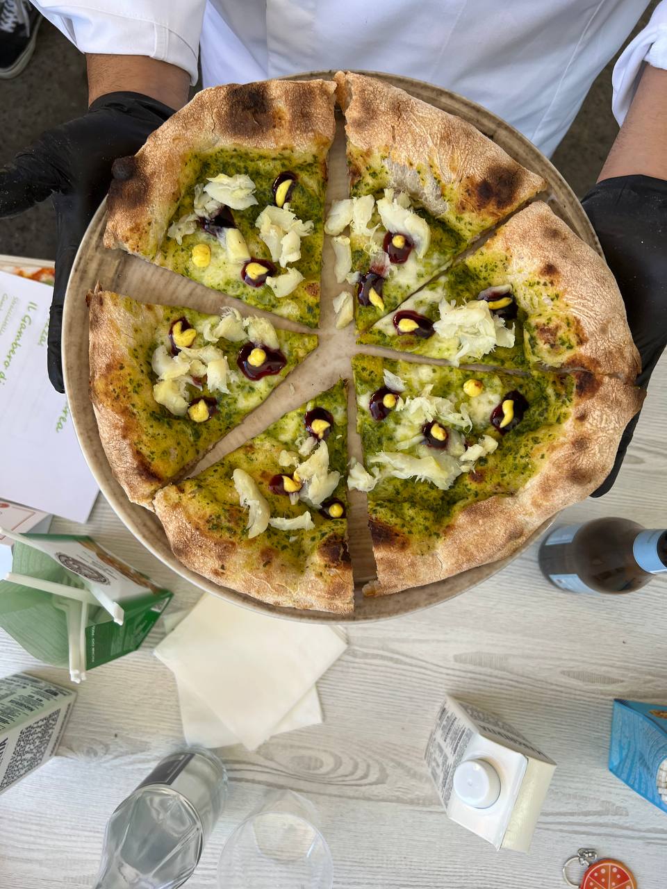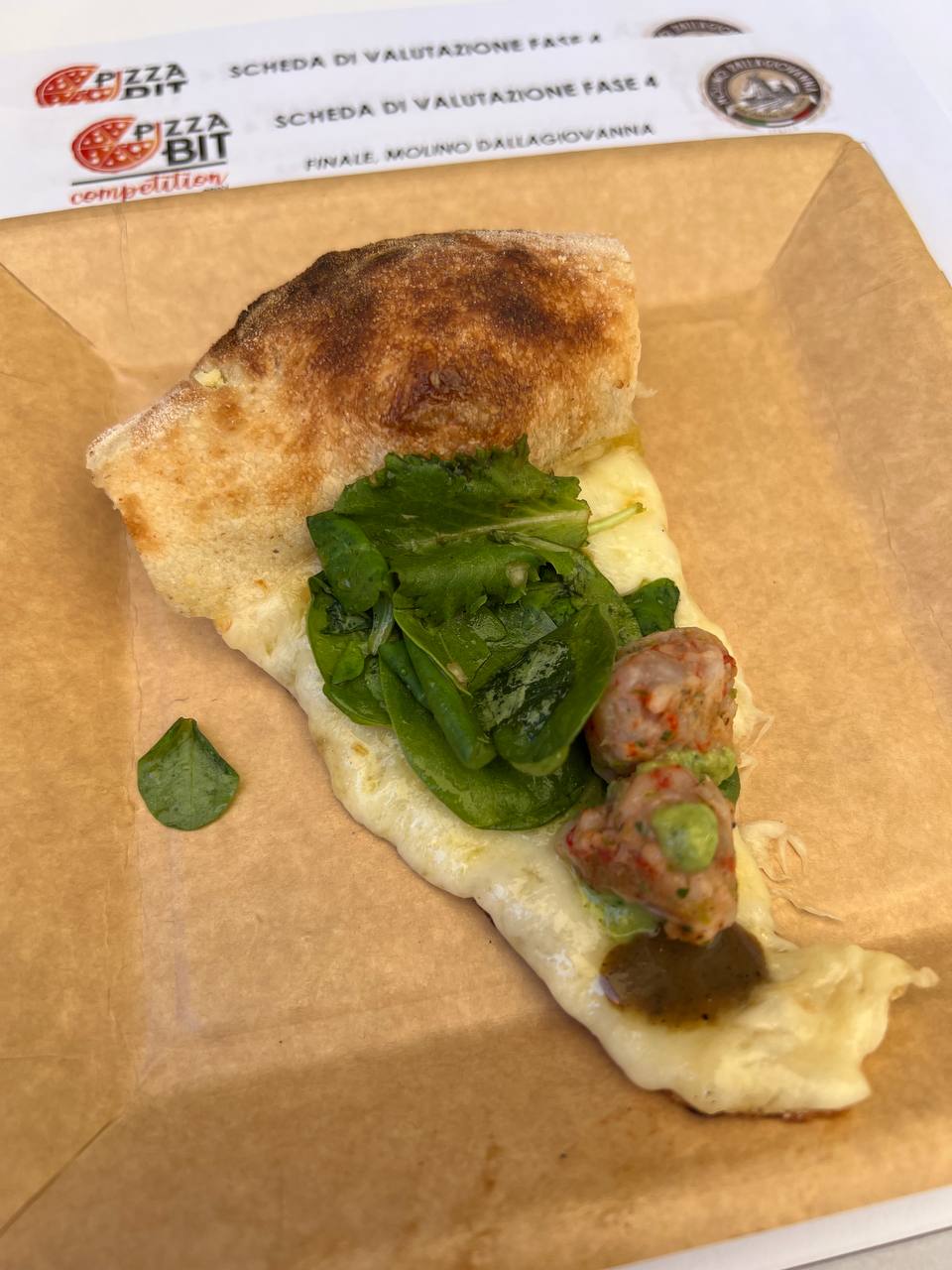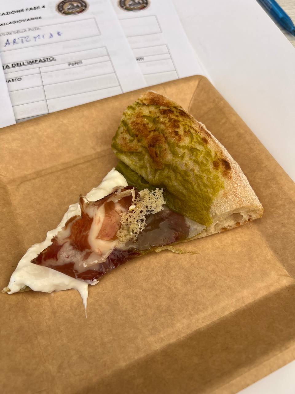 Il penultimo finalista della giornata si è presentato con una Pizza chiama Cavolo che baccalà e, come suggerisce il nome :D, è fatta con crema di cavolo trunzo, fior di latte, baccalà in olio cottura, confettura di gelsi neri dell’Etna e formaggio piacentino ennese.