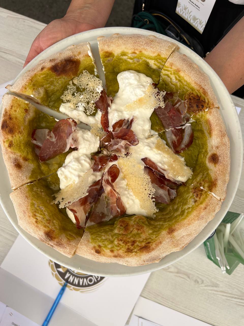 Il secondo finalista ha presentato una Pizza dal nome Artemide (di cui sopra potete vedere la ricetta dell’impasto) ed è fatta vellutata di asparagi mentre fuori forno con l’aggiunta di cuore di burrata pugliese, coppa piacentina, cialda di parmigiano reggiano 24 mesi, basilico fresco e olio EVO lucano.