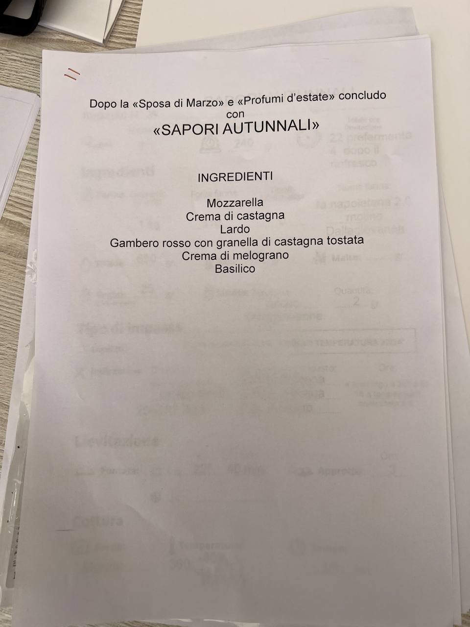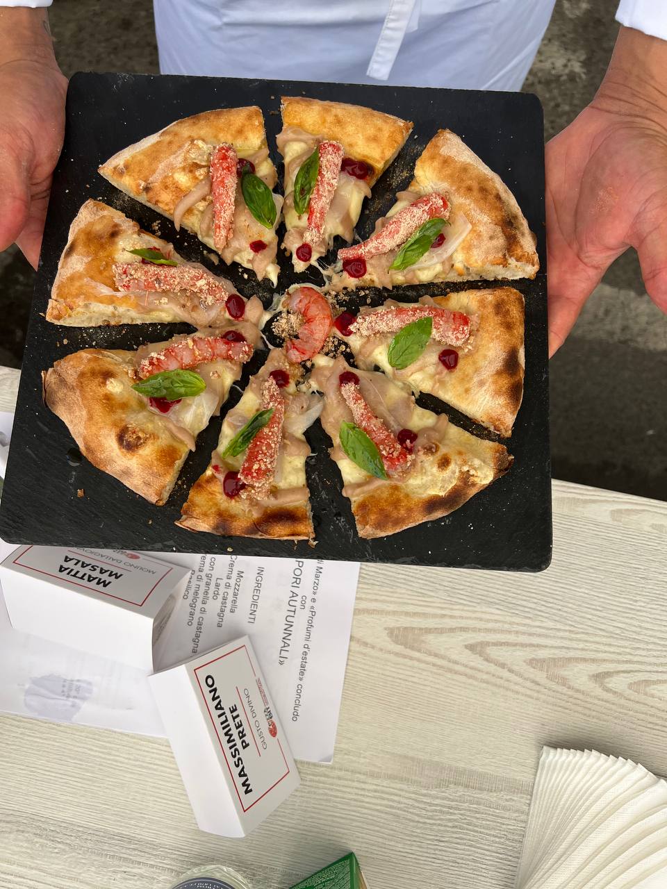 La Pizza presentata dal primo finalista si chiama Sapori Autunnali ed è fatta con mozzarella, crema di castagna, lardo, gambero rosso con granella di castagna tostata, crema di melograno e basilico.
