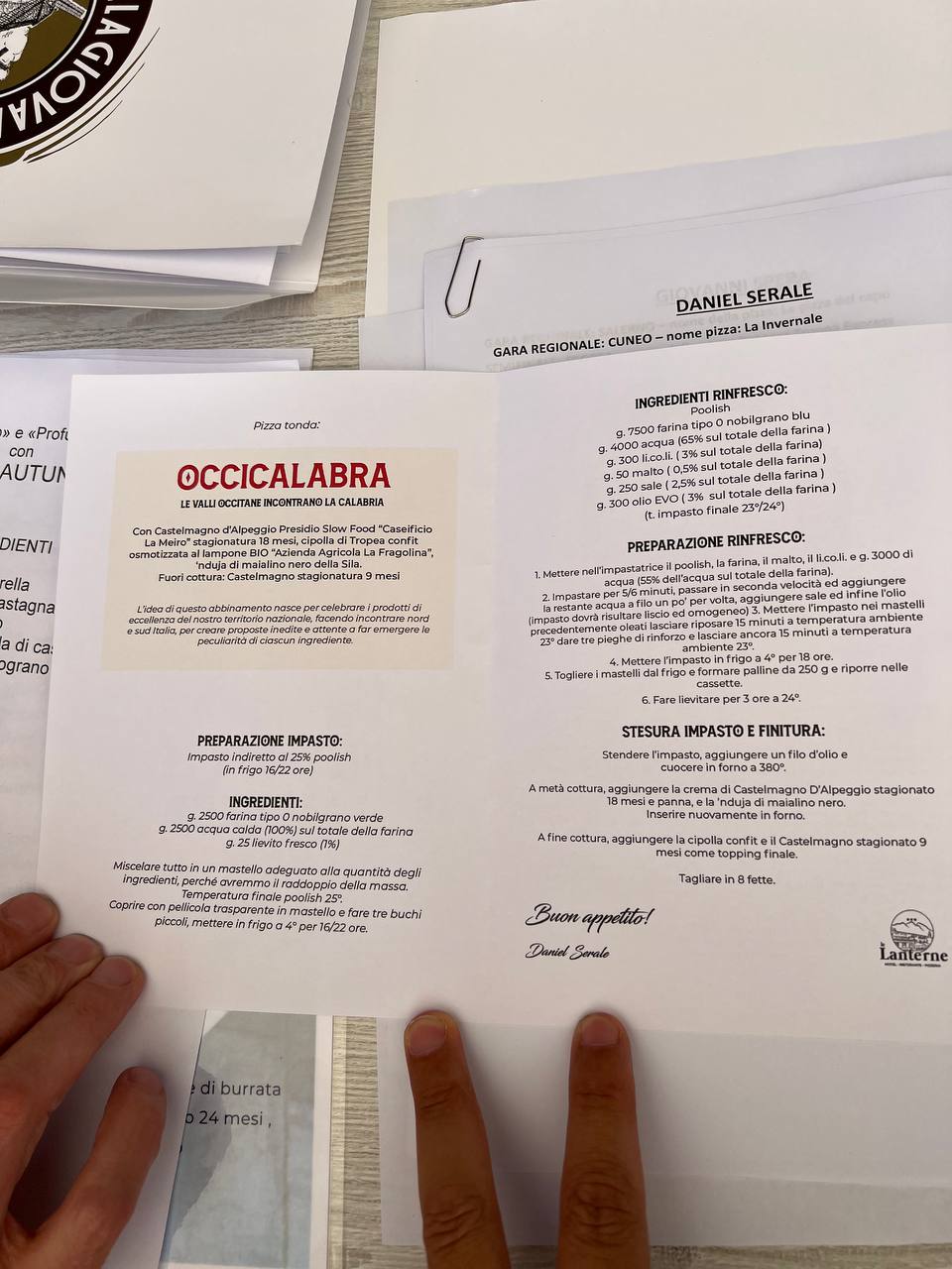 Il terzo finalista si è presentato dinanzi alla giuria con una pizza dal nome Occicalabra e fatta con Castelmagno d’Alpeggio Presidio Slow Food “Caseificio La Meiro” stagionatura 18 mesi, cipolla di Tropea confit aromatizzata al lampone BIO “Azienda Agricola La Fragola”, ‘nduja di maialino nero della Sila e fuori cottura Castellano stagionatura 9 mesi.