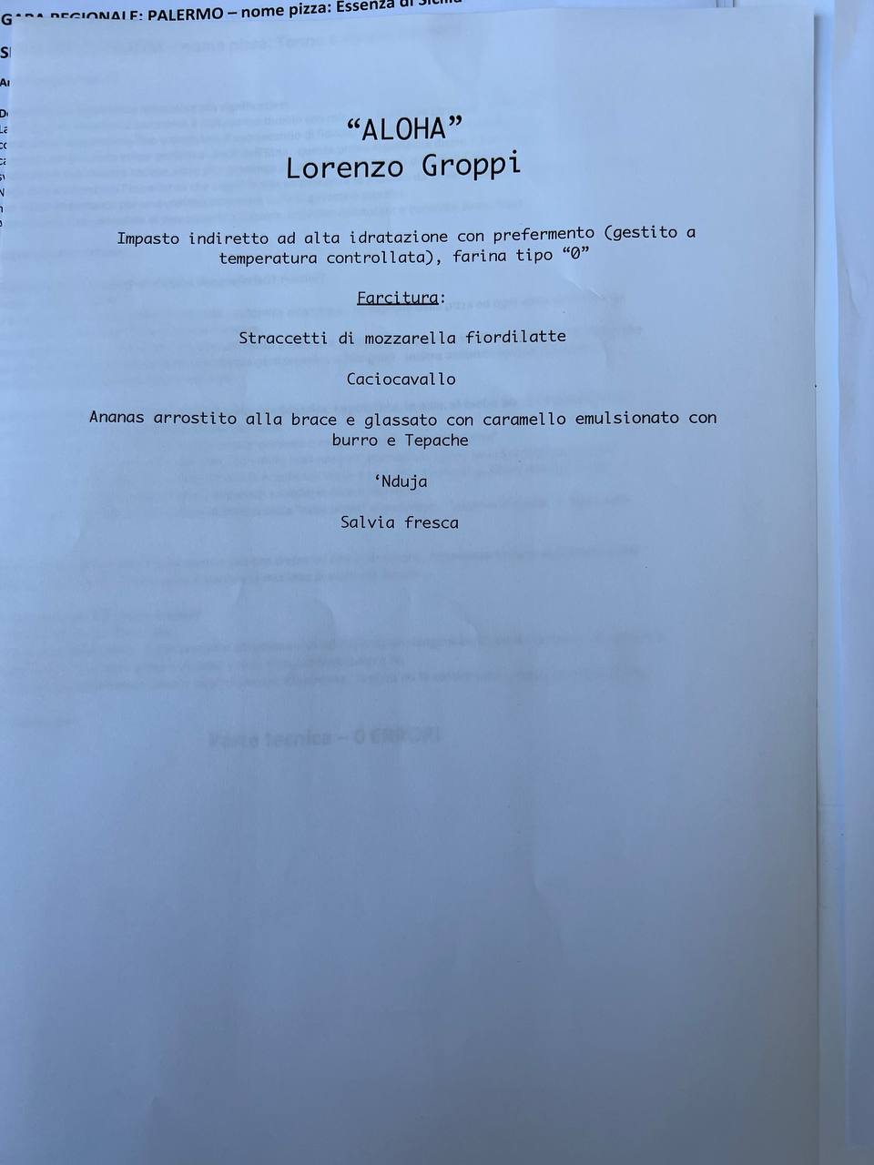 La pizza proposta dall’ultima finalista si chiama Aloha in onore di un ingrediente ovvero l’ananas, che in questo caso era arrostito alla brace e glassato con caramello emulsionato con burro e Tepache, oltre a stracotti di mozzarella fior di latte, caciocavallo, ‘nduja e salvia fresca.
