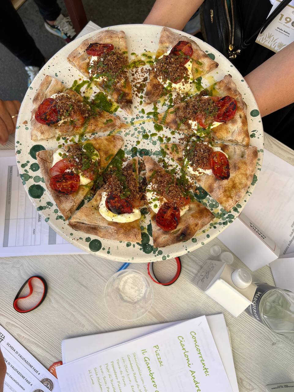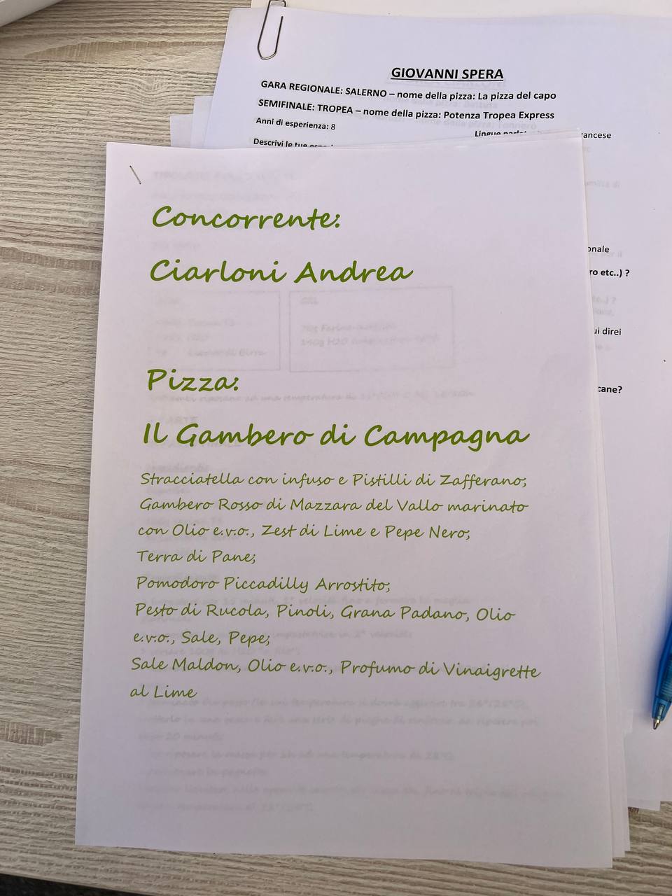 La Pizza presentata invece dal quinto finalista si chiama Il Gambero di Campagna ed è fatta con stracciatella con infuso e pistilli di zafferano, gambero rosso di Mazara del Vallo marinato con olio EVO, zest di lime e pepe nero, terra di pane, pomodoro Piccadilly arrostito, pesto di rucola, pinoli, grana padano, olio EVO, sale e pepe.