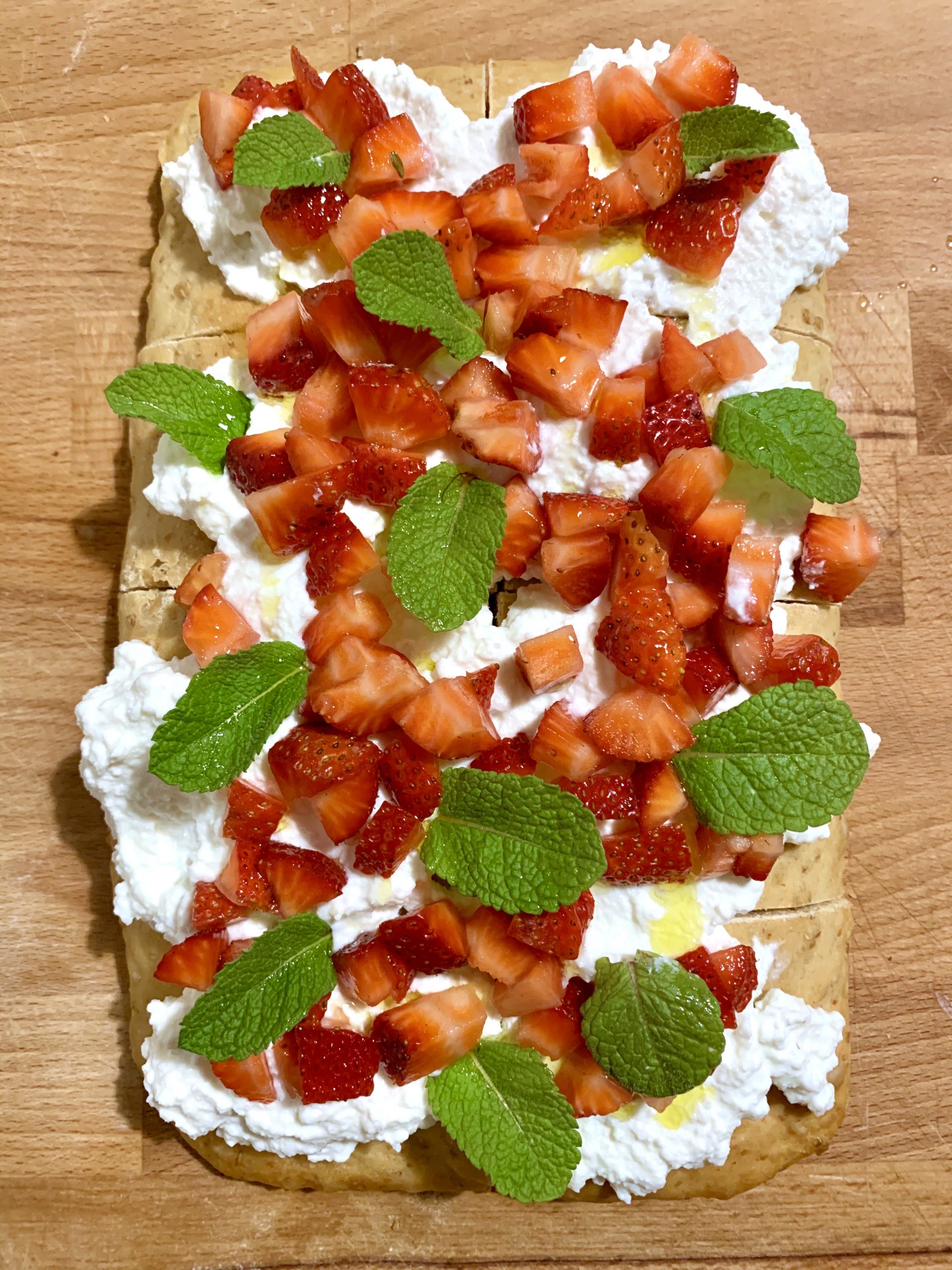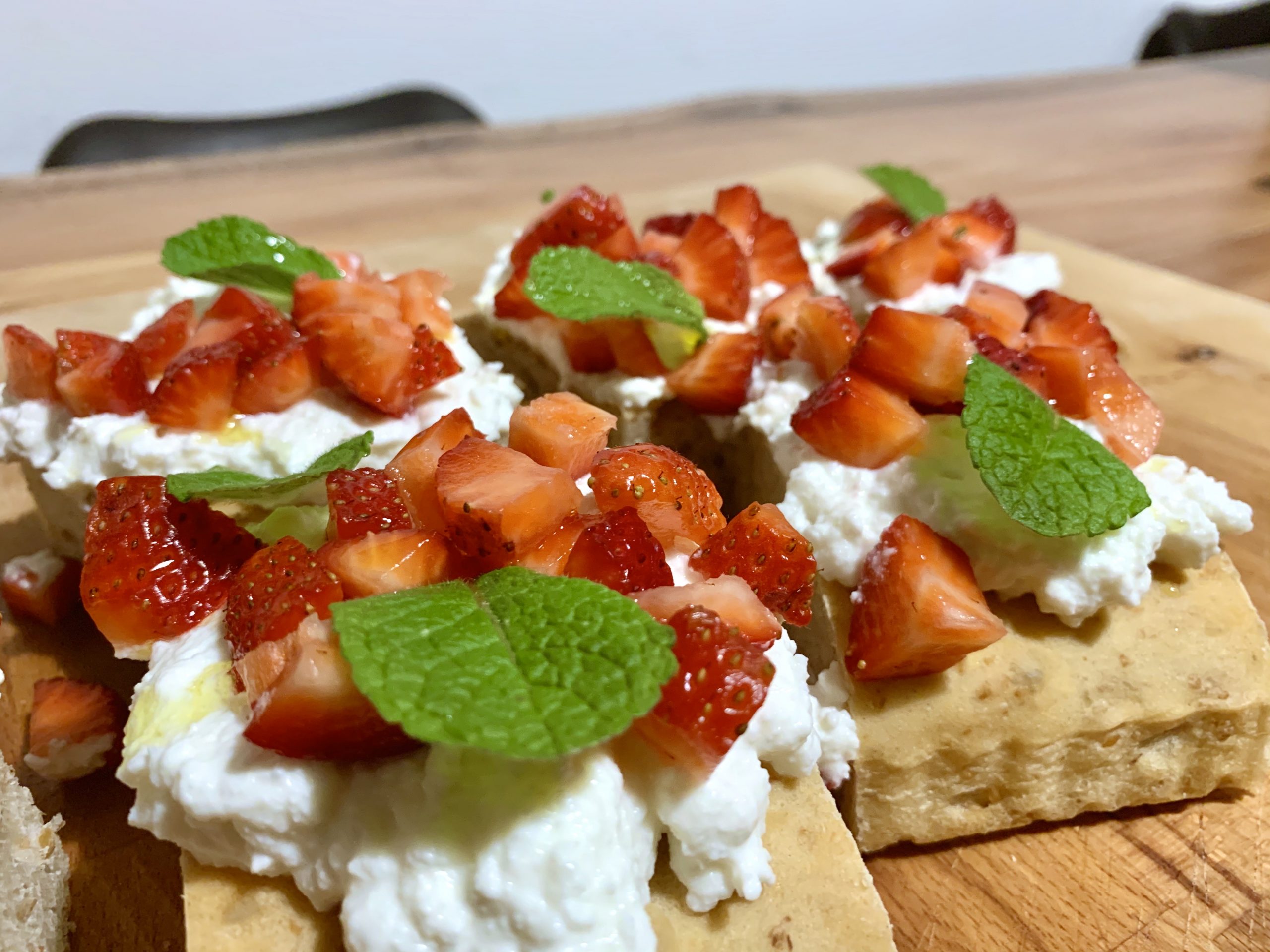 In uscita farcite con la ricotta che avete precedentemente zuccherato, e 10 fragole marinate con menta e limone.